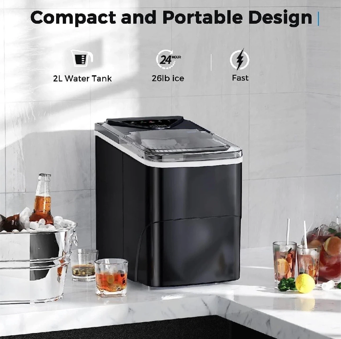 Get ready for summer with this compact and portable ice maker! It features a 2L water tank and can produce up to 26lbs of ice in 24 hours. Perfect for parties and keeping your drinks cool