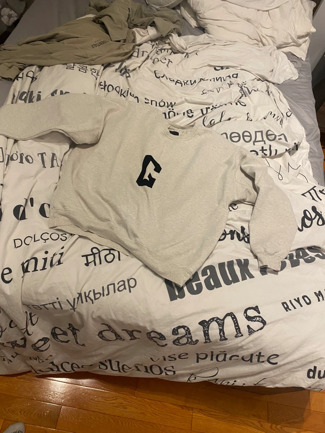 This is a light grey crewneck sweatshirt with a black 'G' logo on the chest. It appears to be made of a comfortable cotton blend. It's a classic crewneck style that's great for everyday wear.