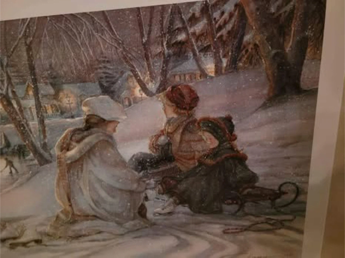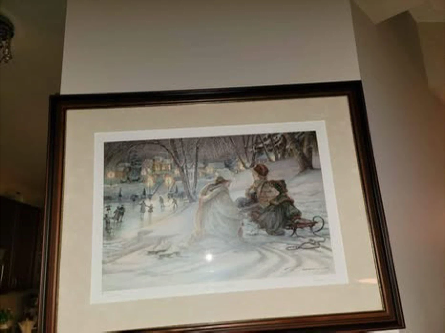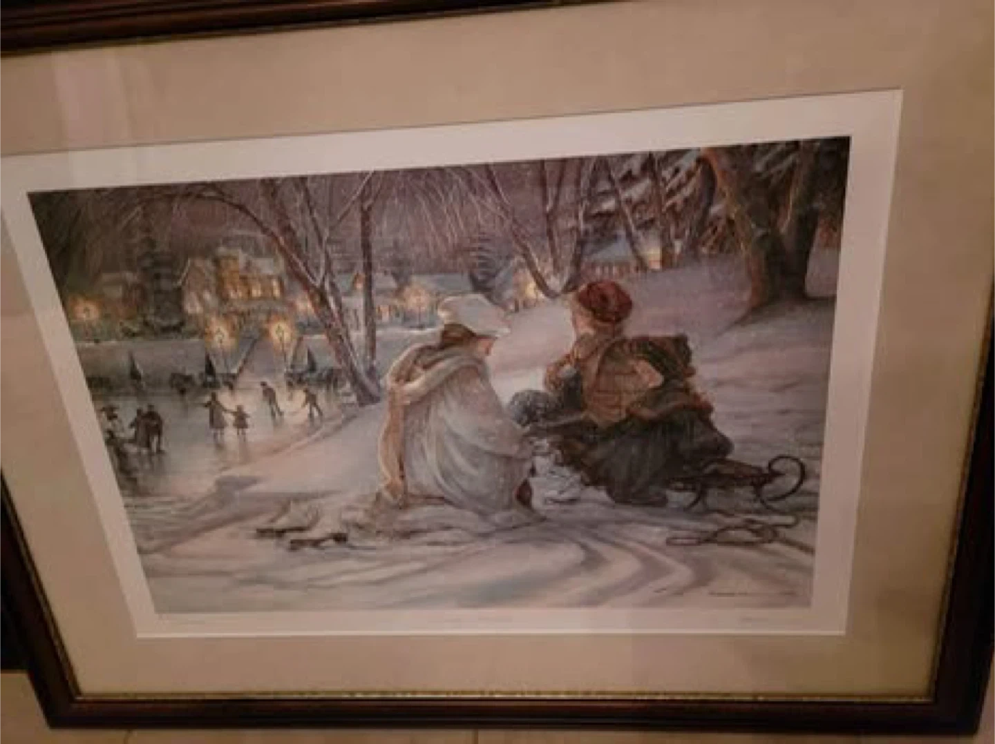 A charming framed limited edition picture depicts a nostalgic winter scene with people ice skating and children on a sled. This artwork is numbered 3035 out of 10,000. It's beautifully matted and framed, ready to hang.