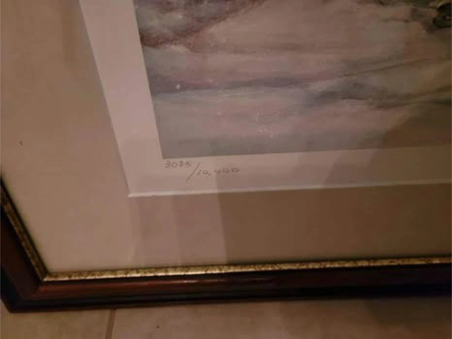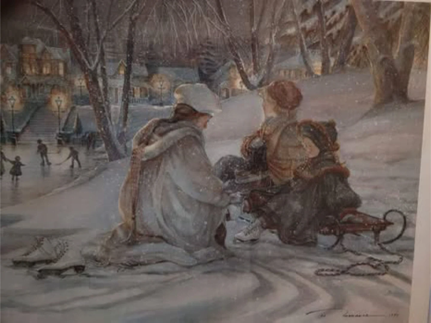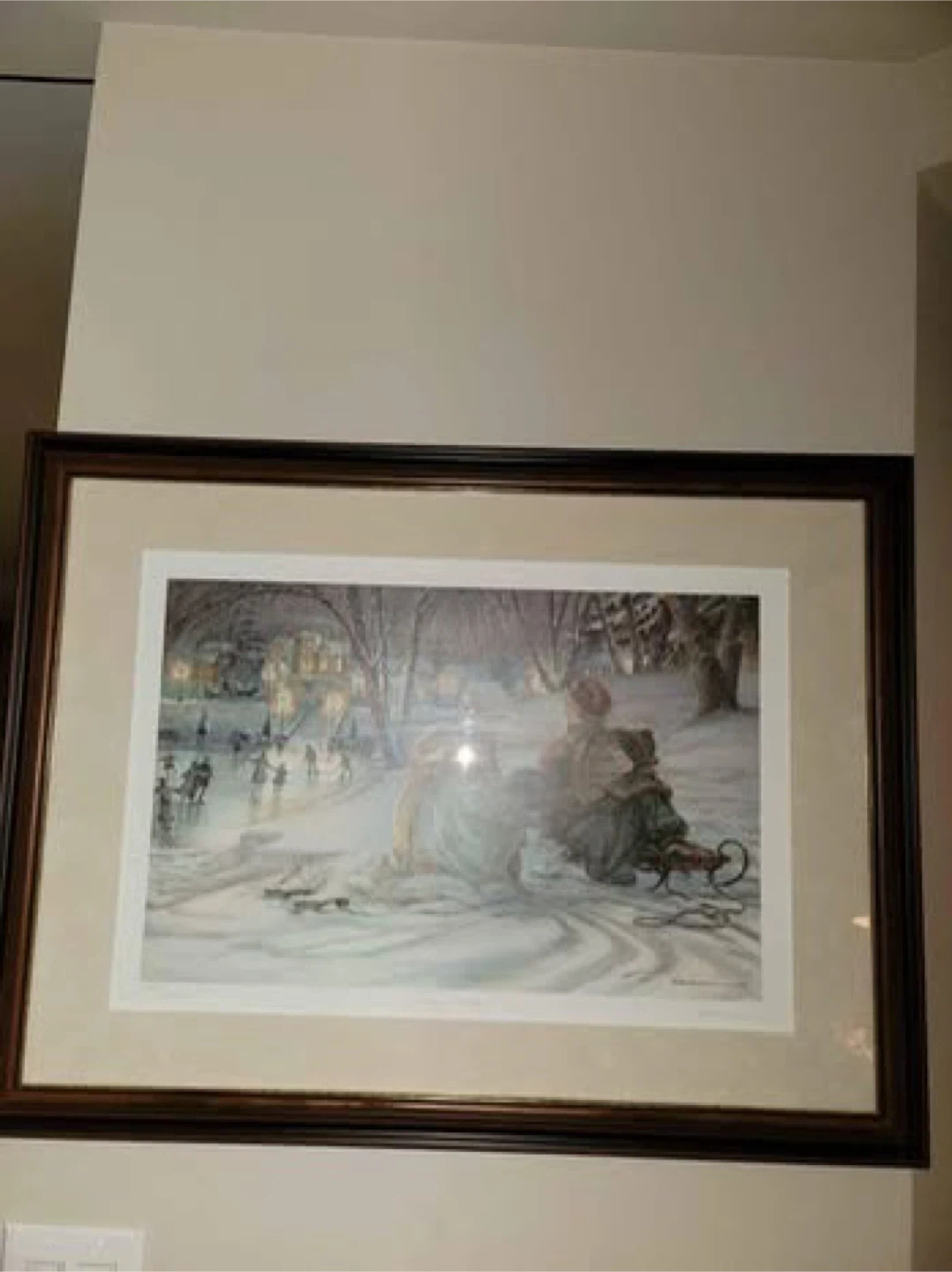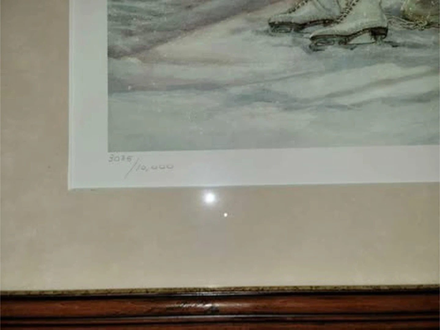 A charming framed limited edition picture depicts a nostalgic winter scene with people ice skating and children on a sled. This artwork is numbered 3035 out of 10,000. It's beautifully matted and framed, ready to hang.