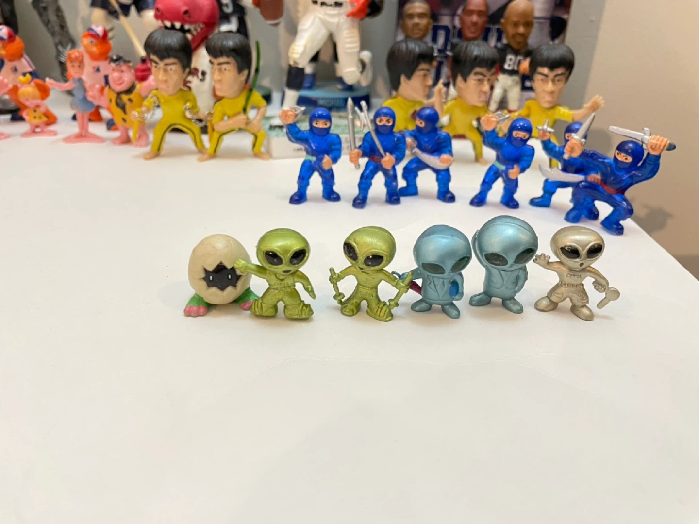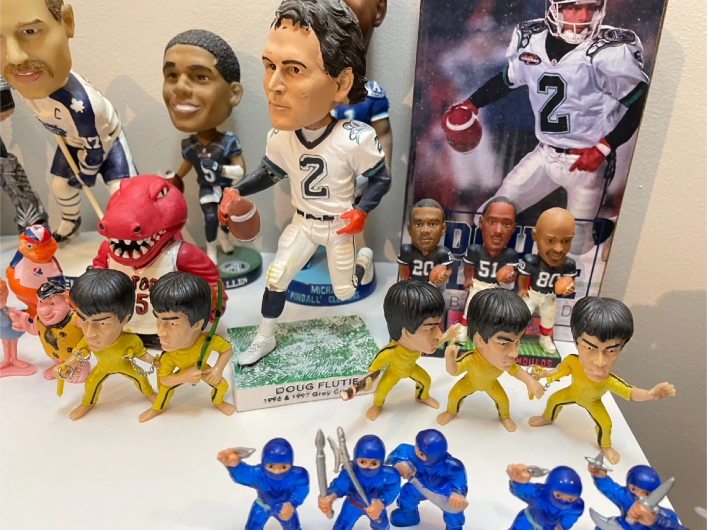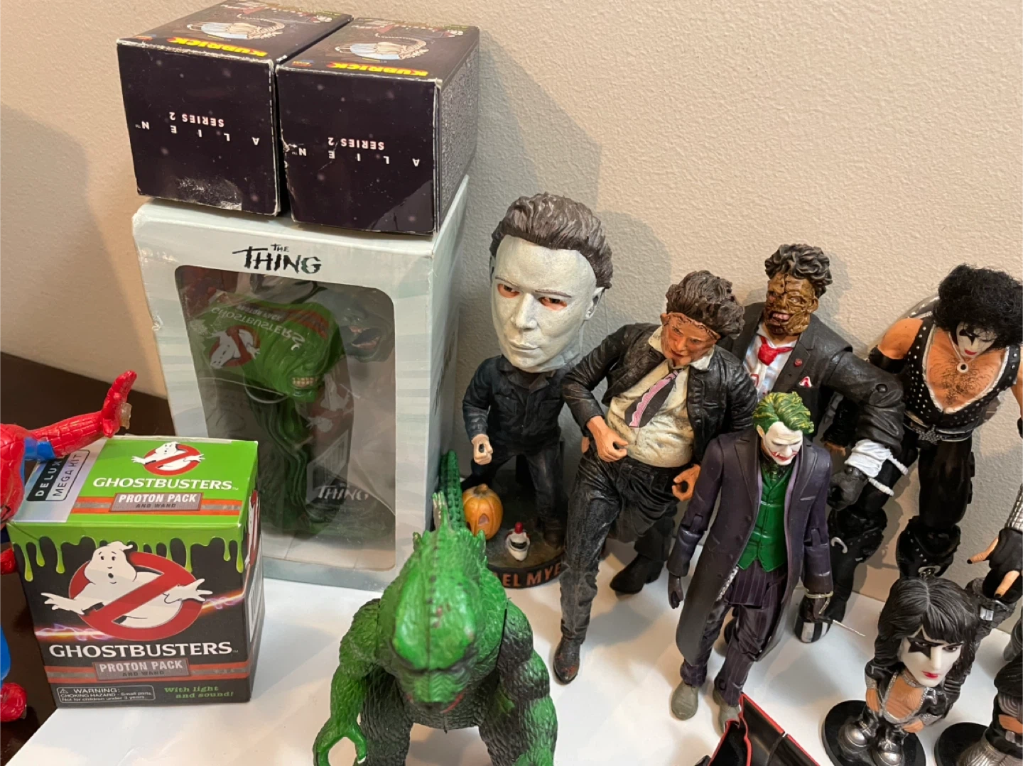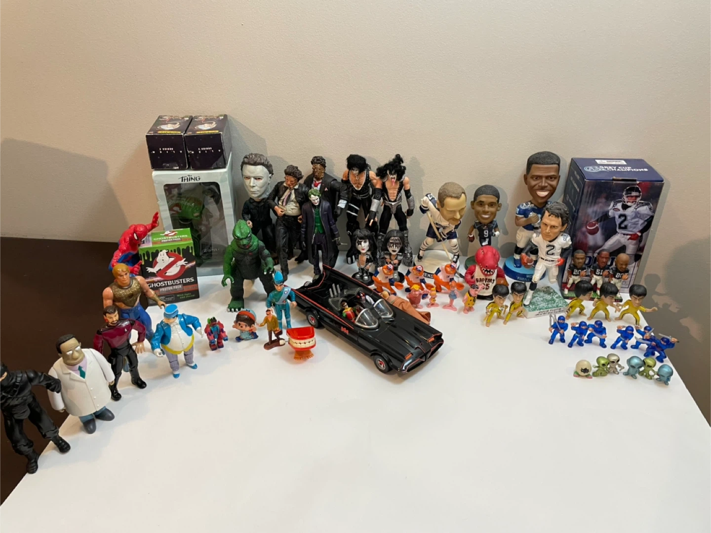 A collection of various action figures and collectibles including characters from movies, TV shows, and sports. Includes items like the Batmobile, Ghostbusters Proton Pack, and Bobbleheads. Many are in original packaging or have it nearby. 5$ and up .