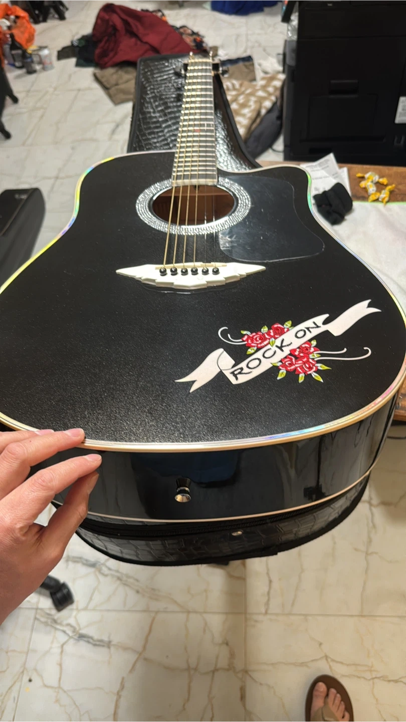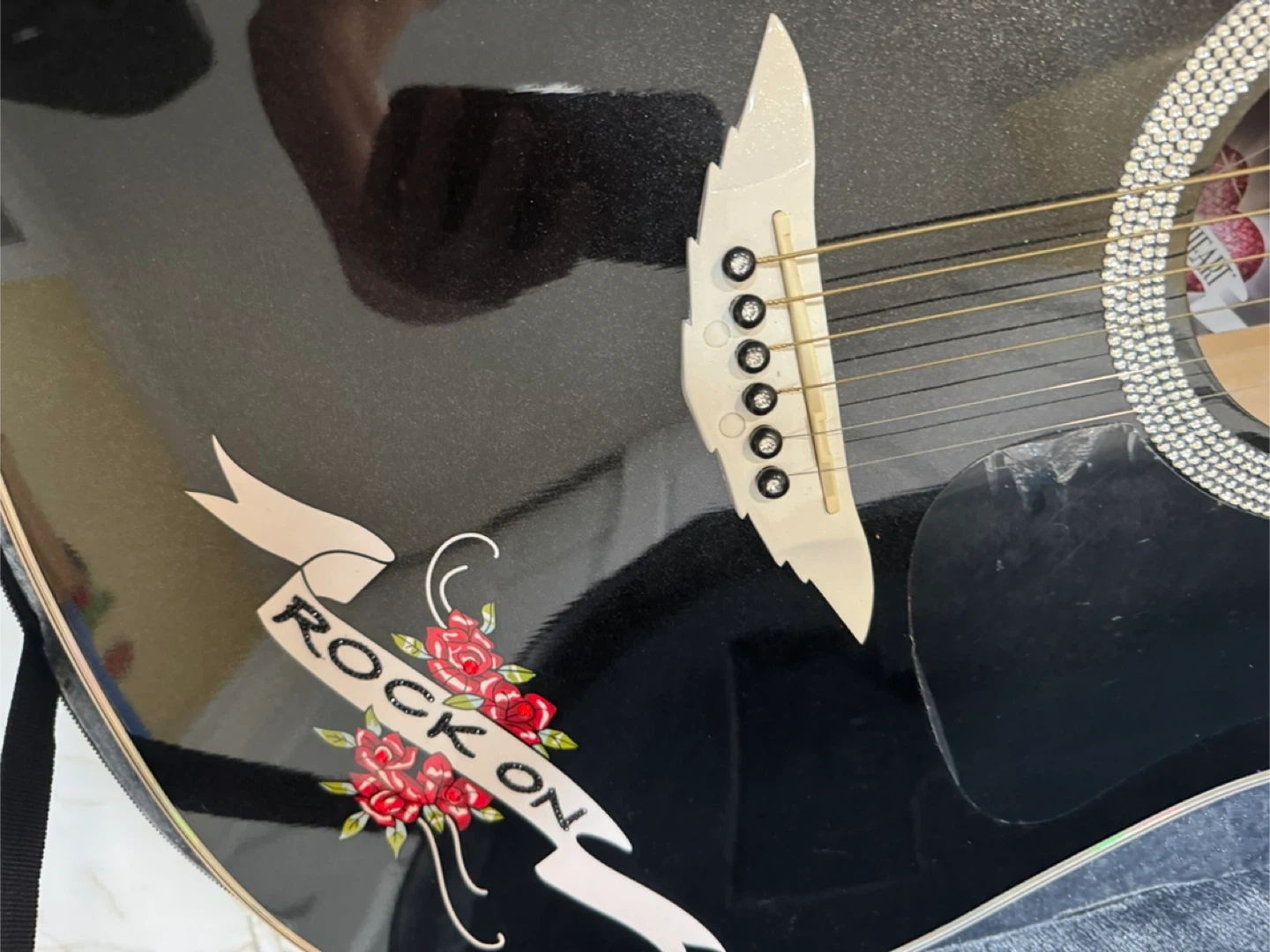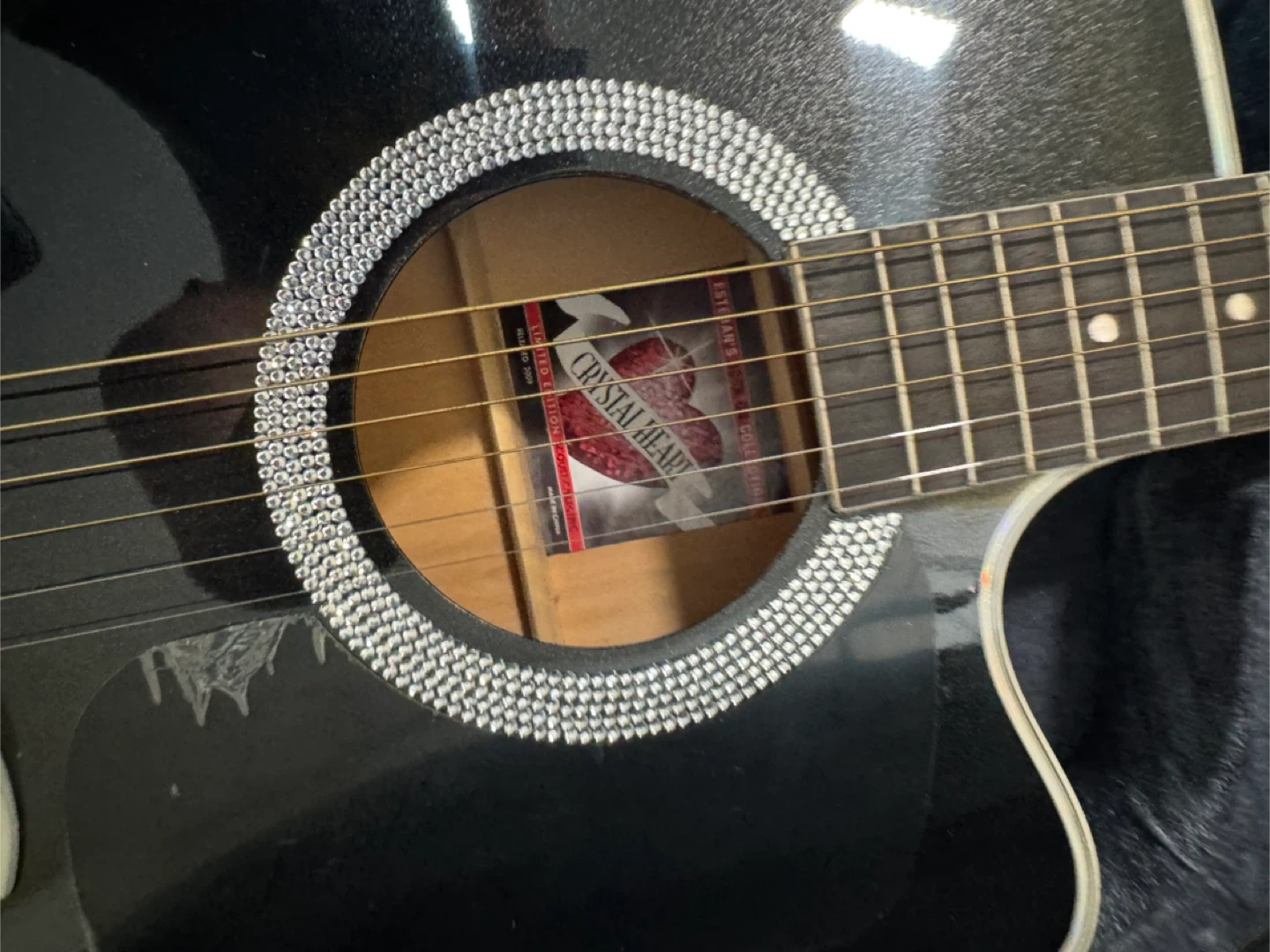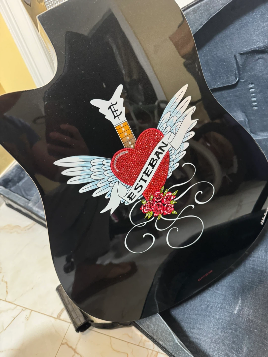 Black acoustic guitar with "Esteban" and "Crystal Heart" graphics. It's in a lined, hard-shell case. Ready to play!. Edición limitada y única. En perfectas condiciones.