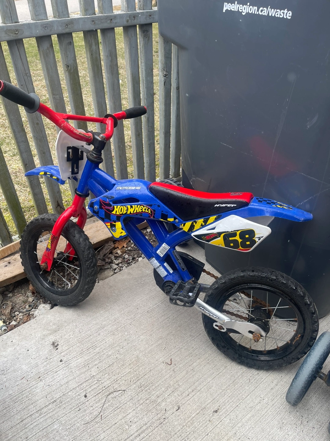 Pre-owned kids' Hot Wheels motocross-style bicycle. Small size, ideal for younger children. Shows some wear from previous use.