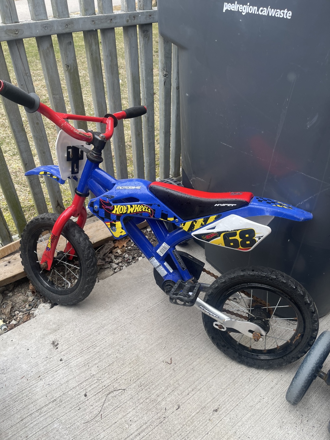 Pre-owned kids' Hot Wheels motocross-style bicycle. Small size, ideal for younger children. Shows some wear from previous use.
