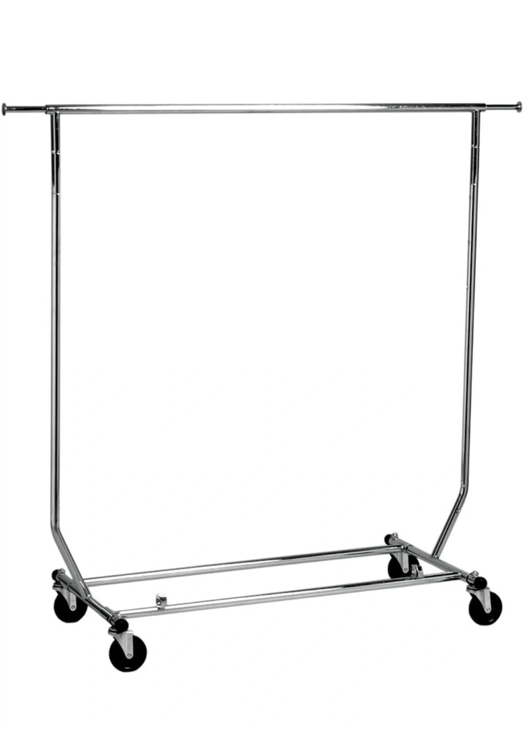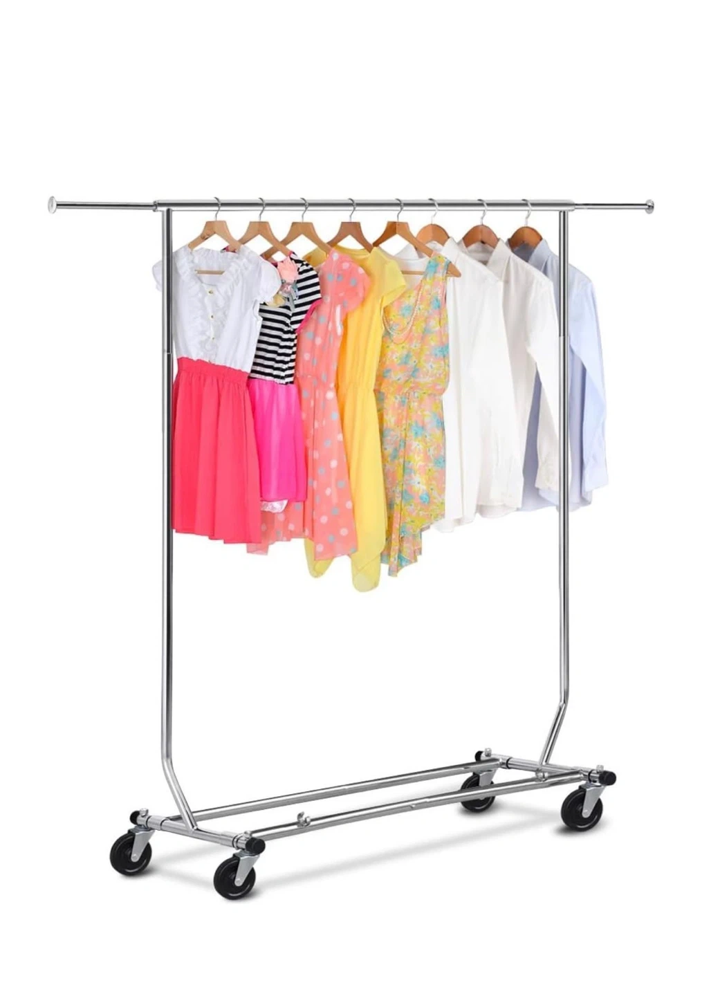 2 metal rolling clothes racks. It's perfect for organizing garments or for use in a laundry room. The racks are on wheels, making it easy to move around. It's collapsible for convenient storage!