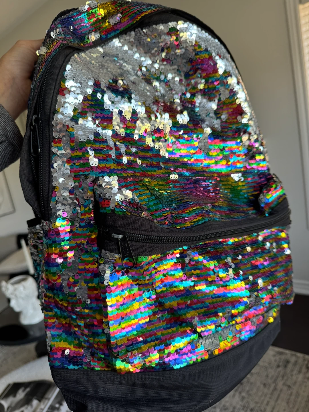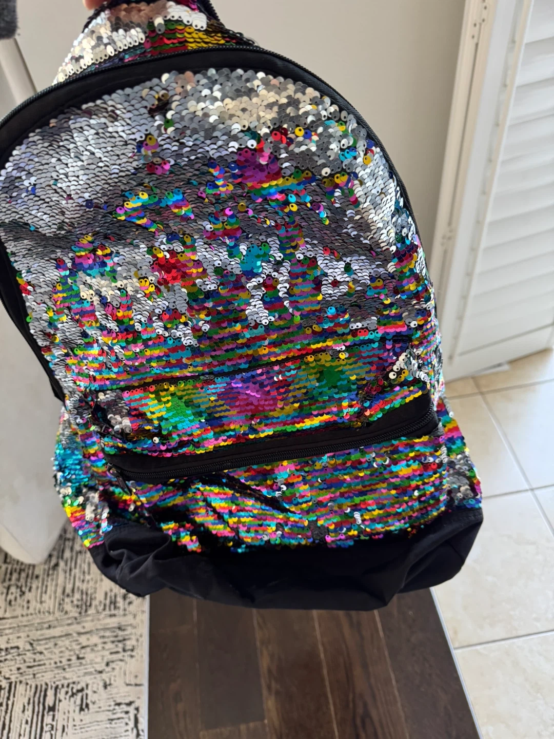 This backpack features vibrant rainbow and iridescent sequins. It has adjustable straps and a zippered main compartment. Perfect for school or everyday use!