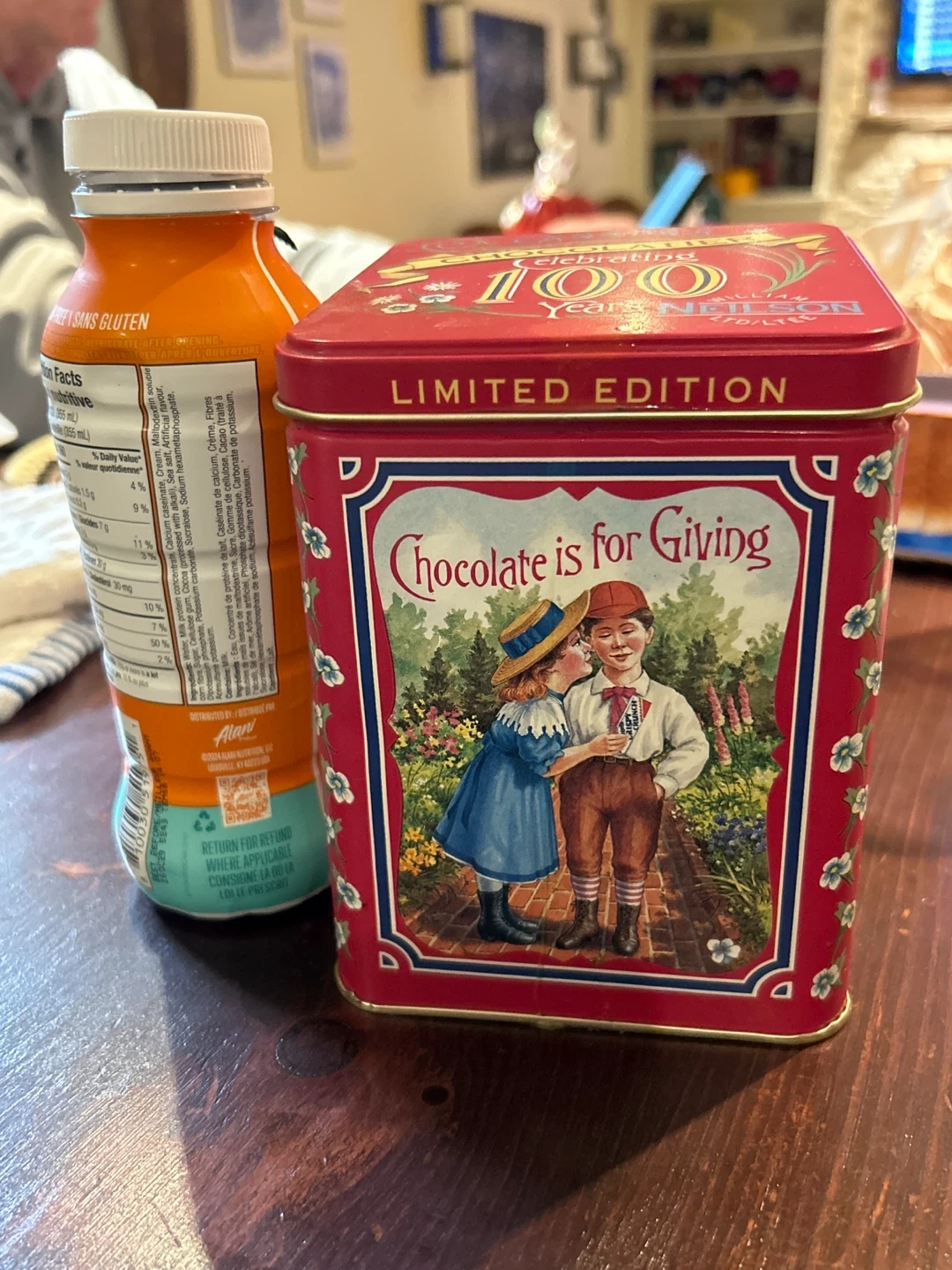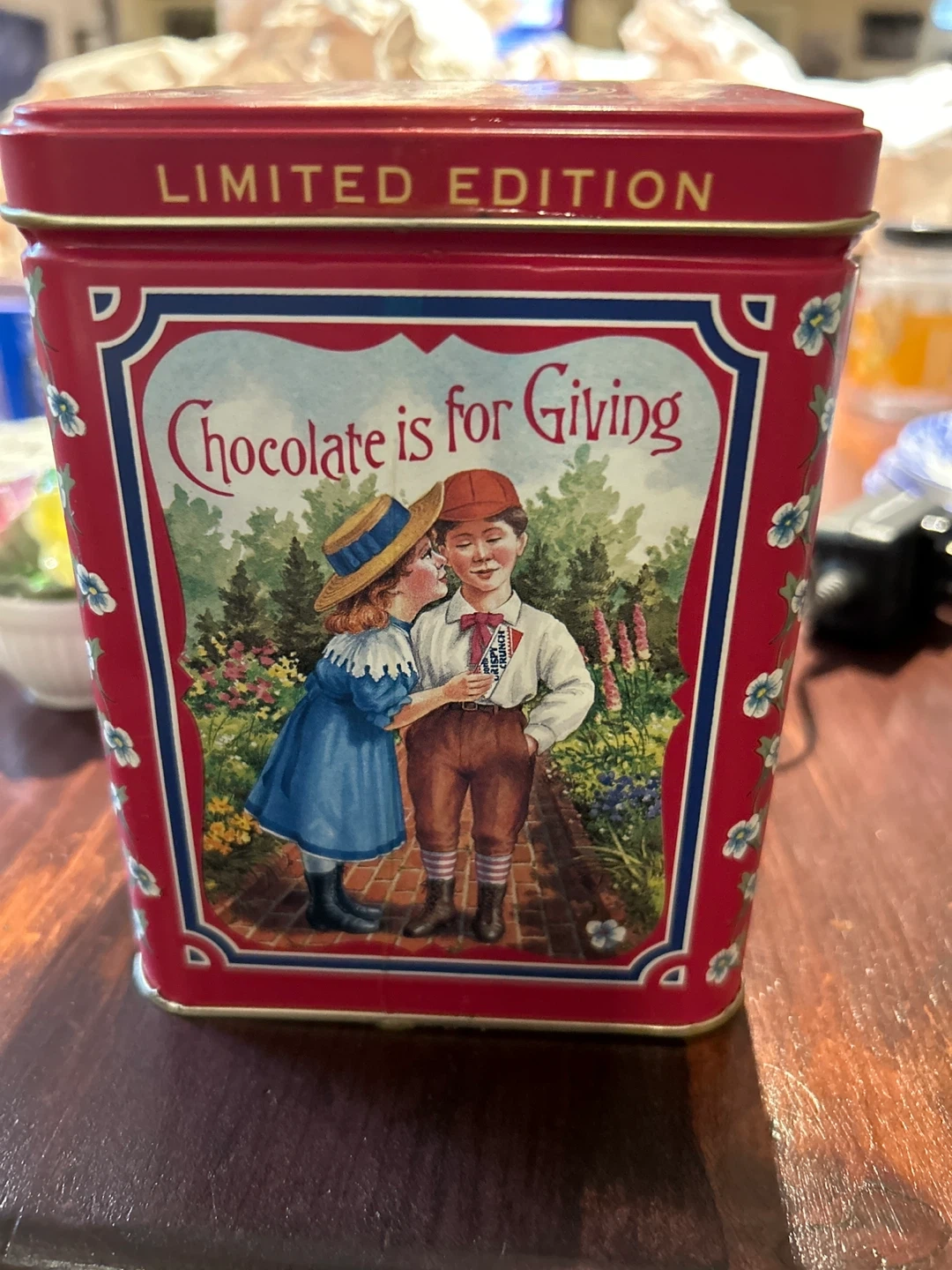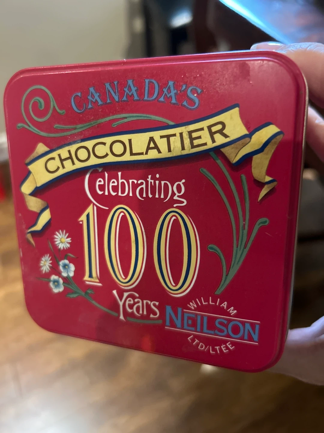 This is a collectible William Neilson 100 Years Limited Edition tin. The tin features a charming vintage illustration and the text "Chocolate is for Giving". It's perfect for storing treats or as a decorative piece.