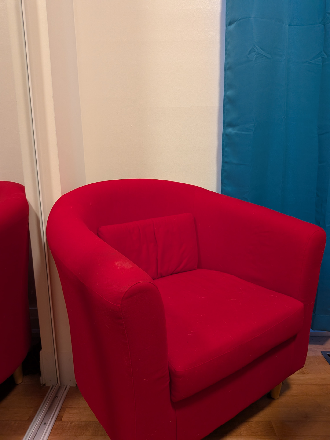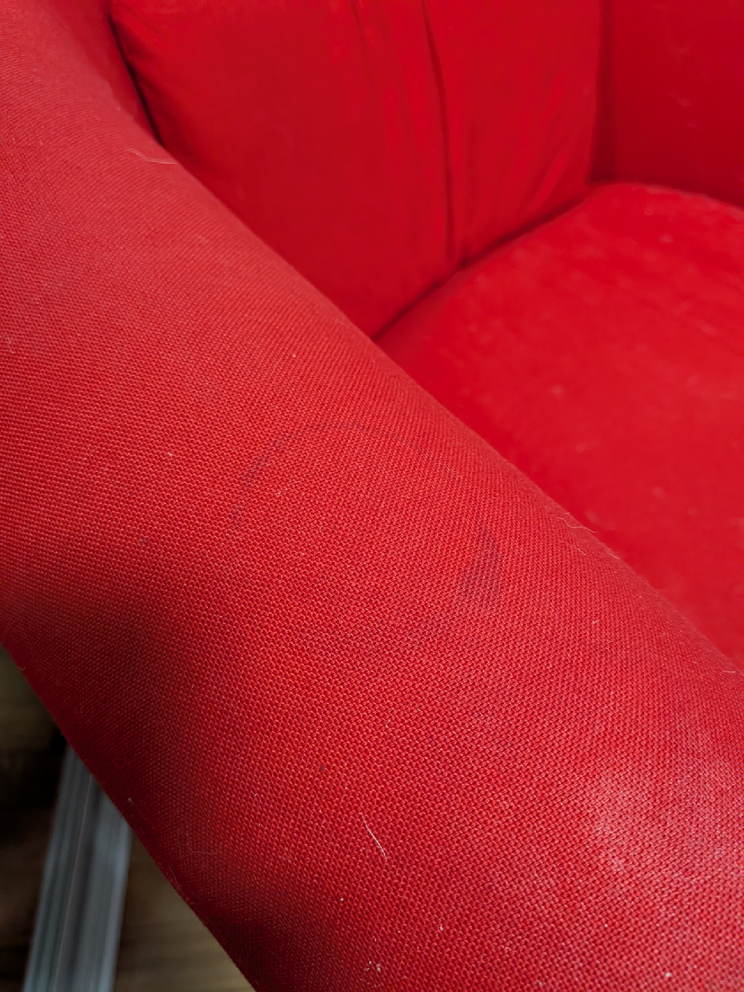 Comfortable red armchair from a smoke free home. Vibrant red, in good condition with slight stain as ahown in second photo.