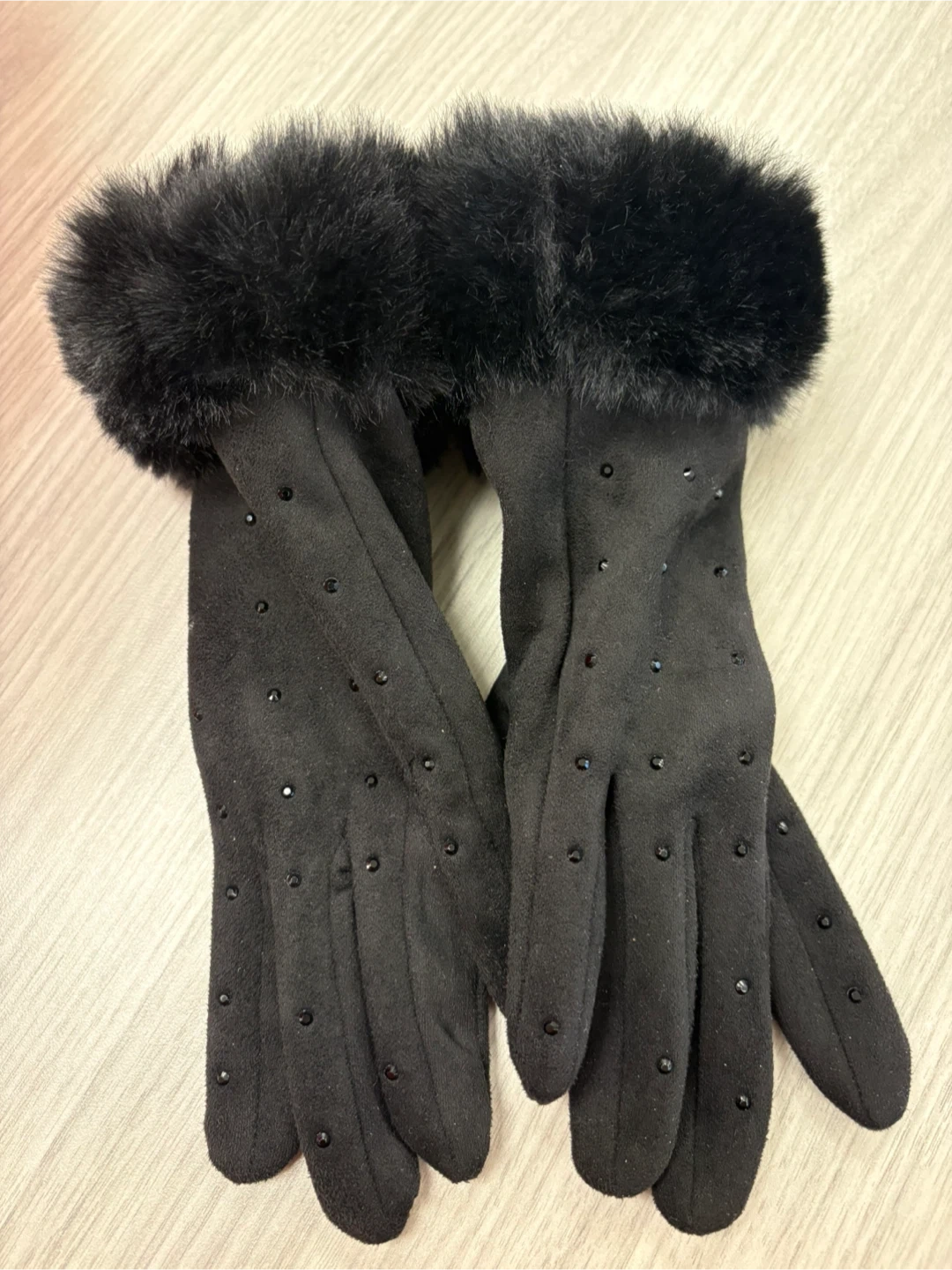 Black Faux Suede Gloves with Rhinestones and Fur Trim