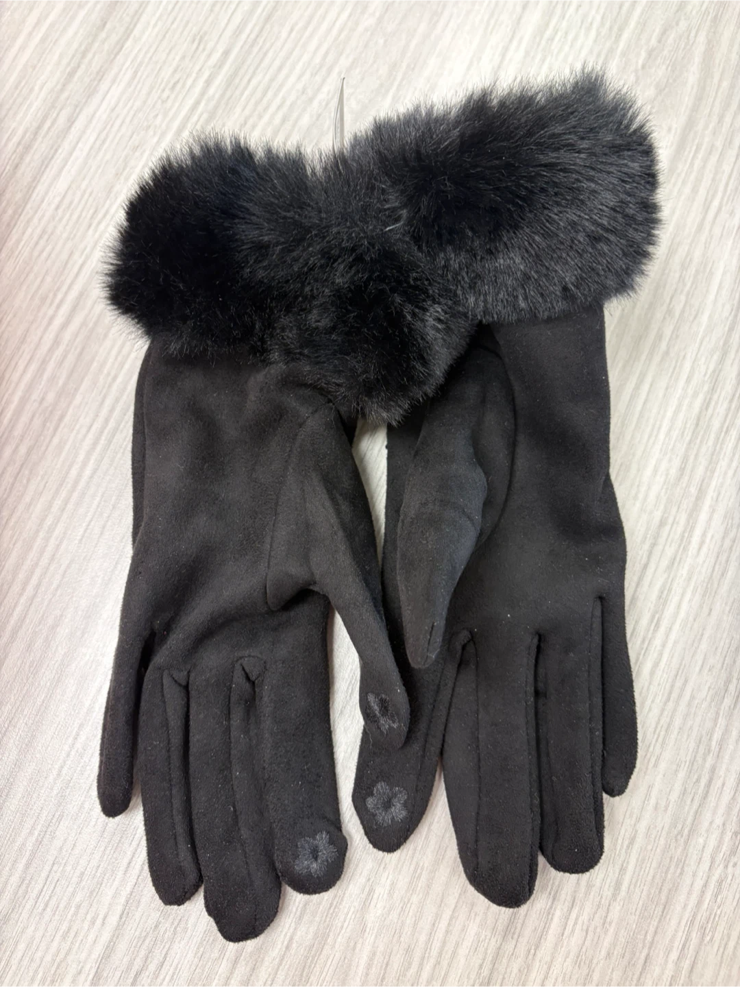 Black Faux Suede Gloves with Rhinestones and Fur Trim