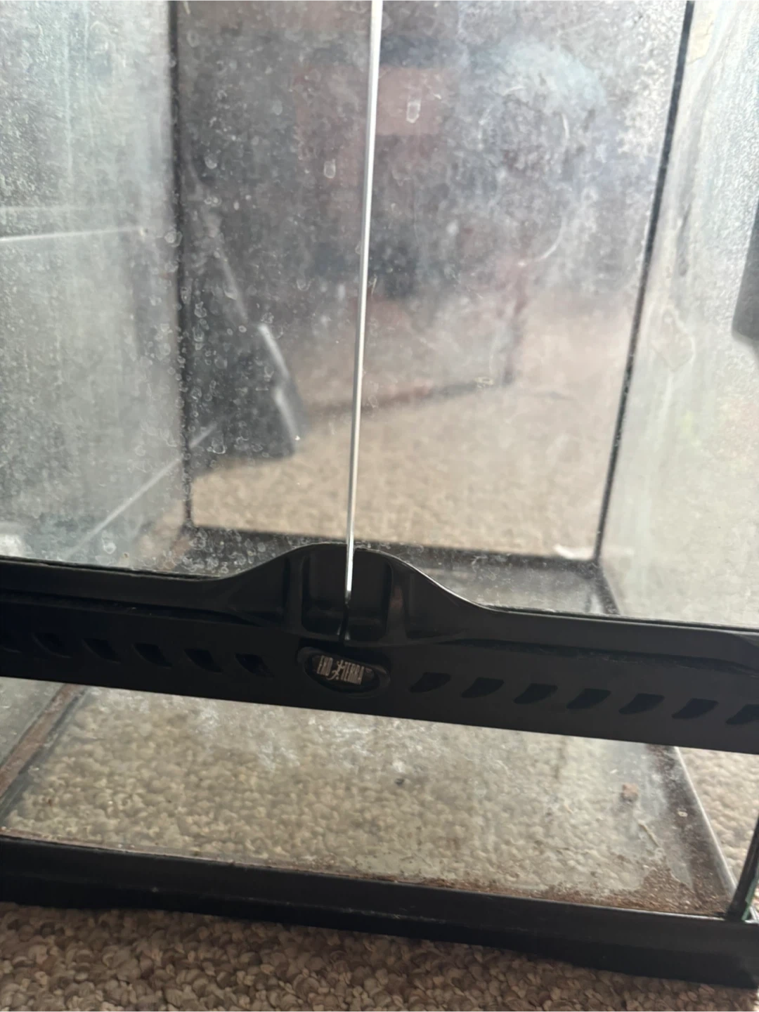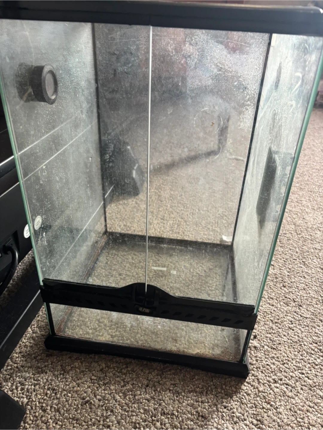 Glass terrarium tank with front opening doors. Includes ventilation. Perfect for reptiles or small animals. Measures approximately 12 x 12 x 18 inches.