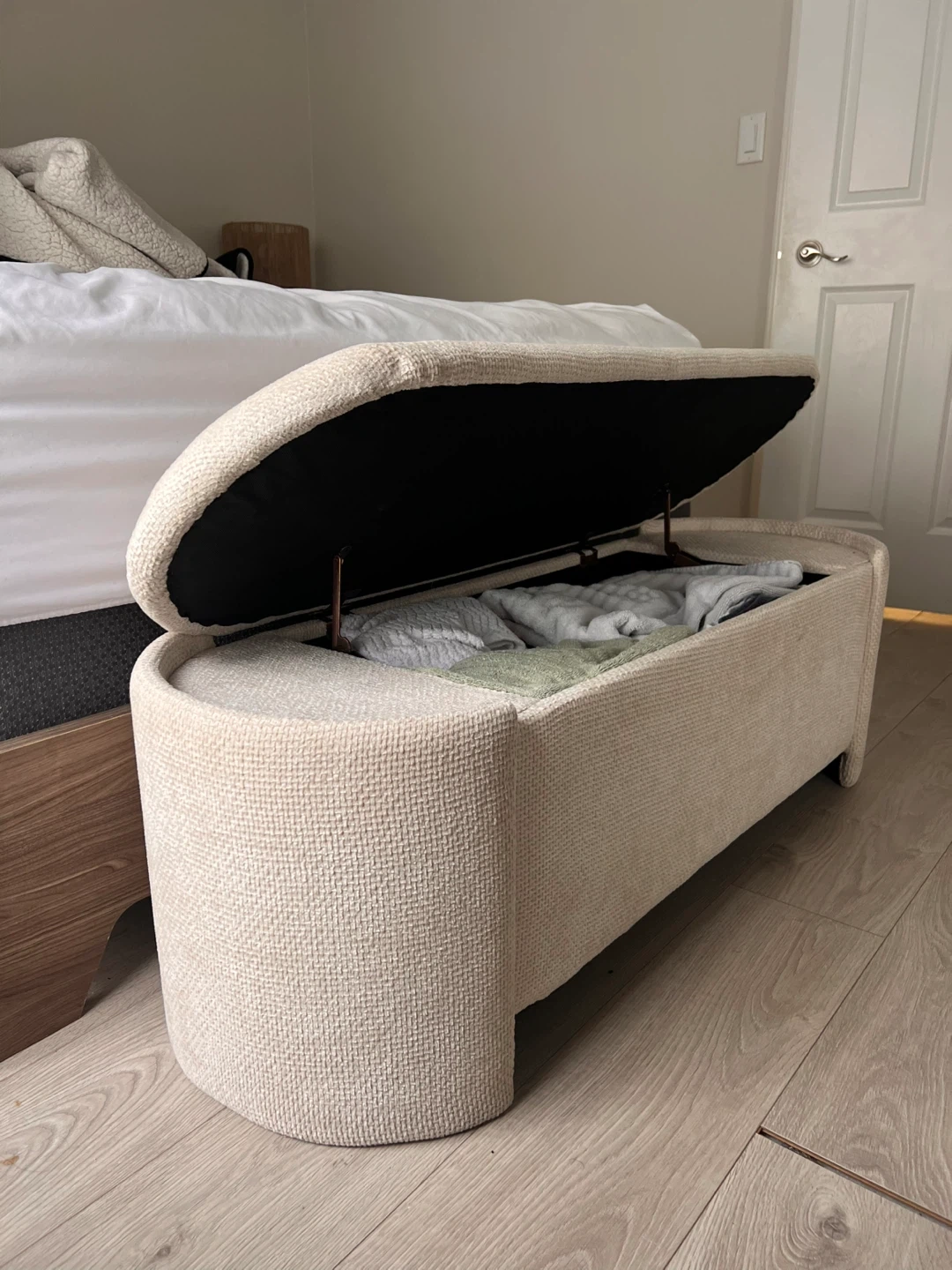 This cream upholstered storage bench offers a convenient spot to store blankets, pillows, or other bedroom essentials. It's perfect for placing at the foot of a bed or in a hallway. The lift-top design makes accessing your stored items easy.