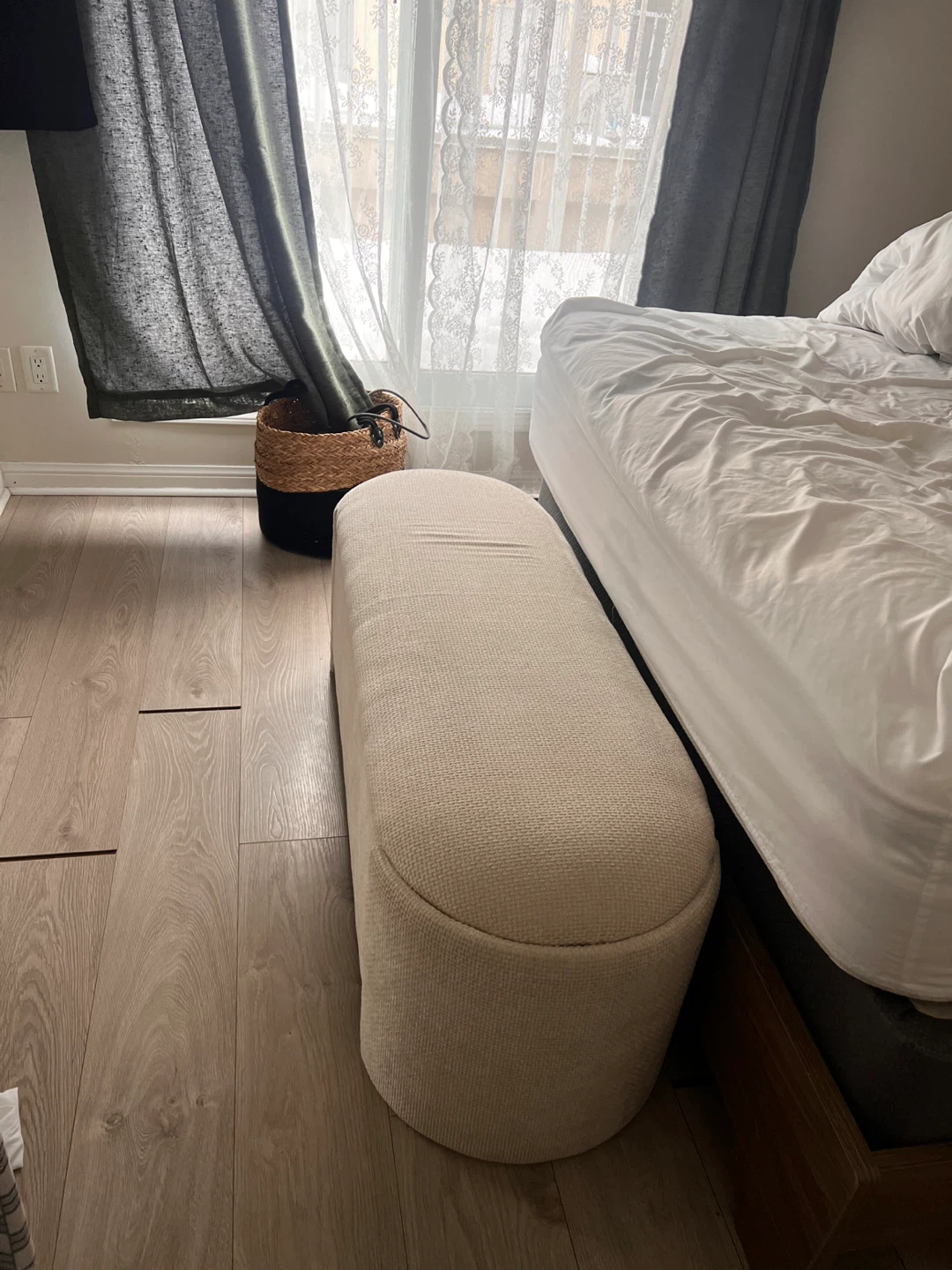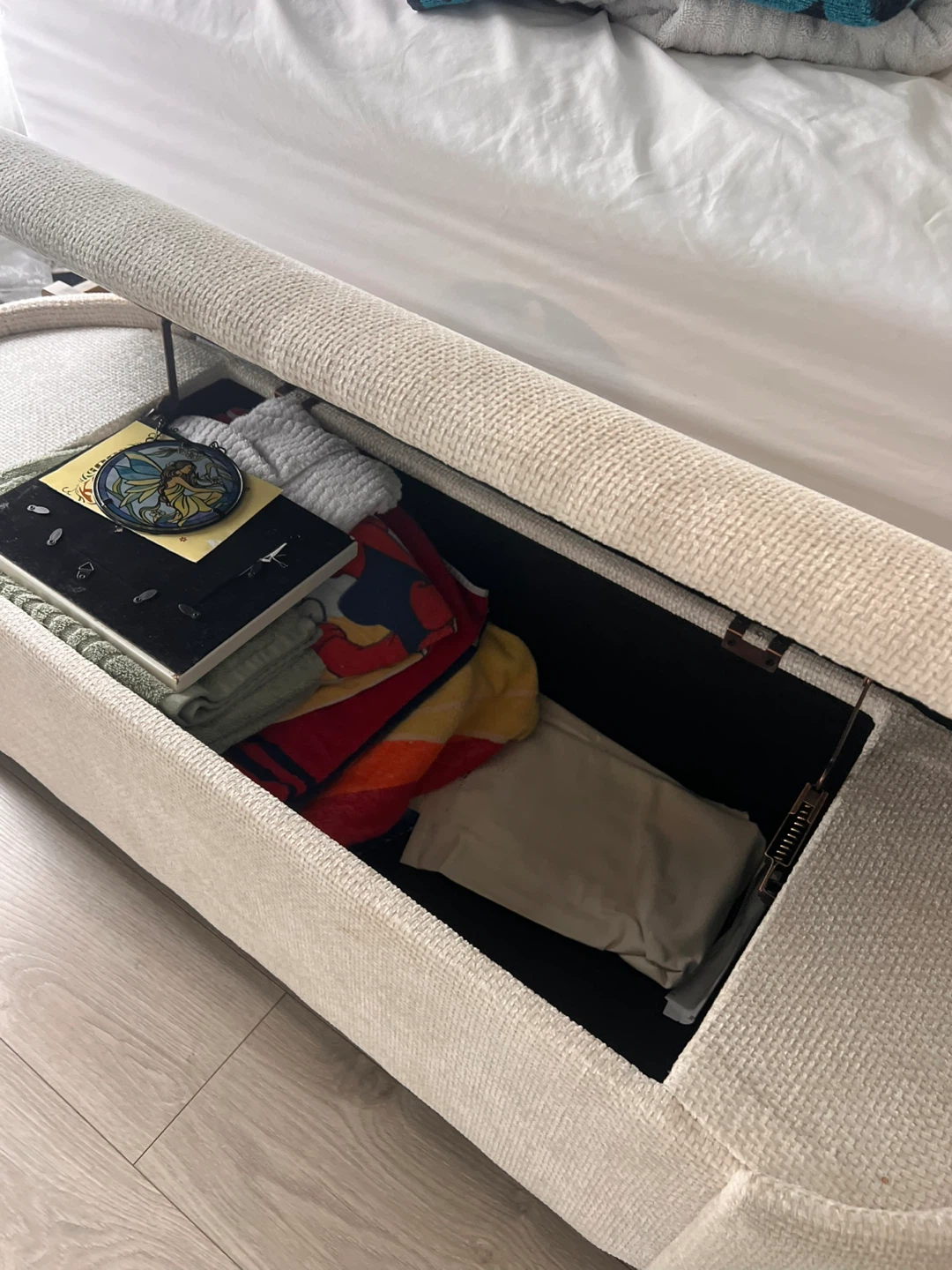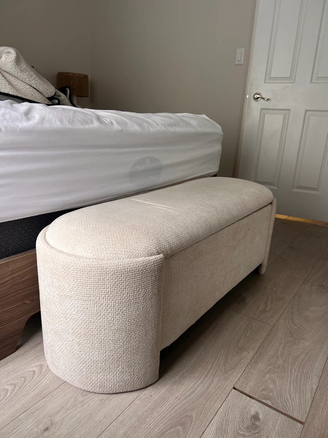 This cream upholstered storage bench offers a convenient spot to store blankets, pillows, or other bedroom essentials. It's perfect for placing at the foot of a bed or in a hallway. The lift-top design makes accessing your stored items easy.