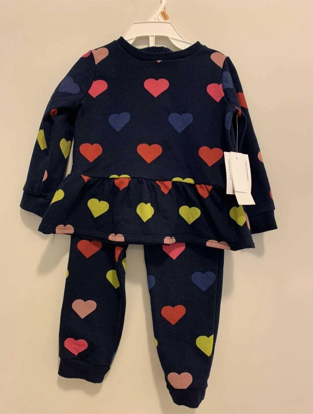 NWT- two-piece outfit for your little one! This adorable set features a long-sleeved top and pants, both covered in colourful hearts. perfect for everyday wear. Size is 18 months 3 seasons.