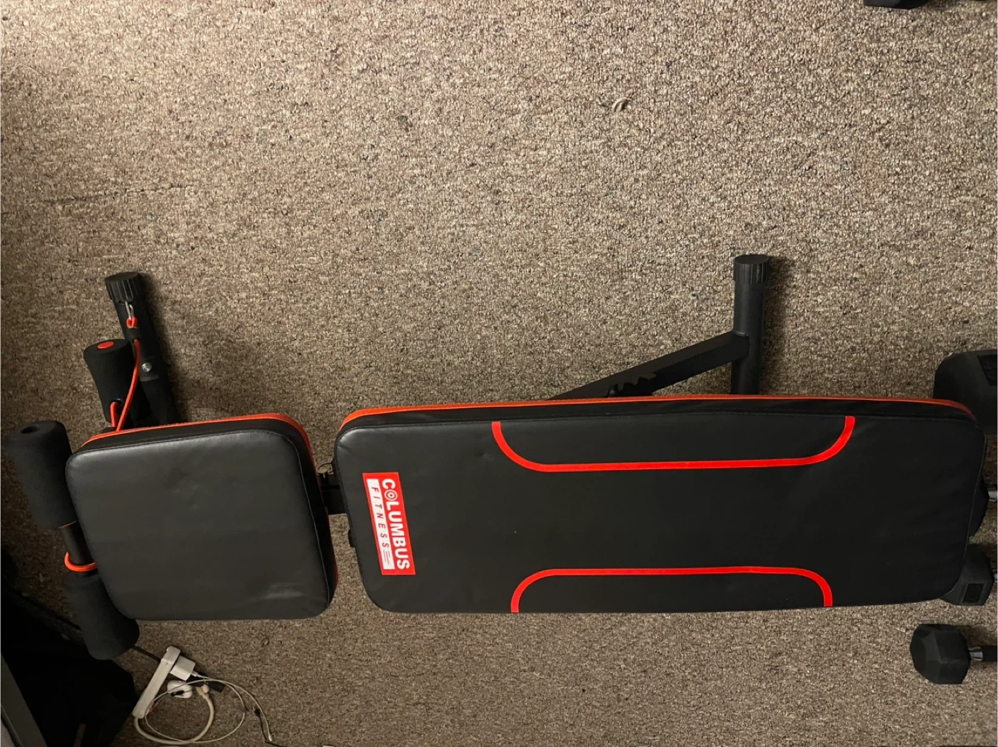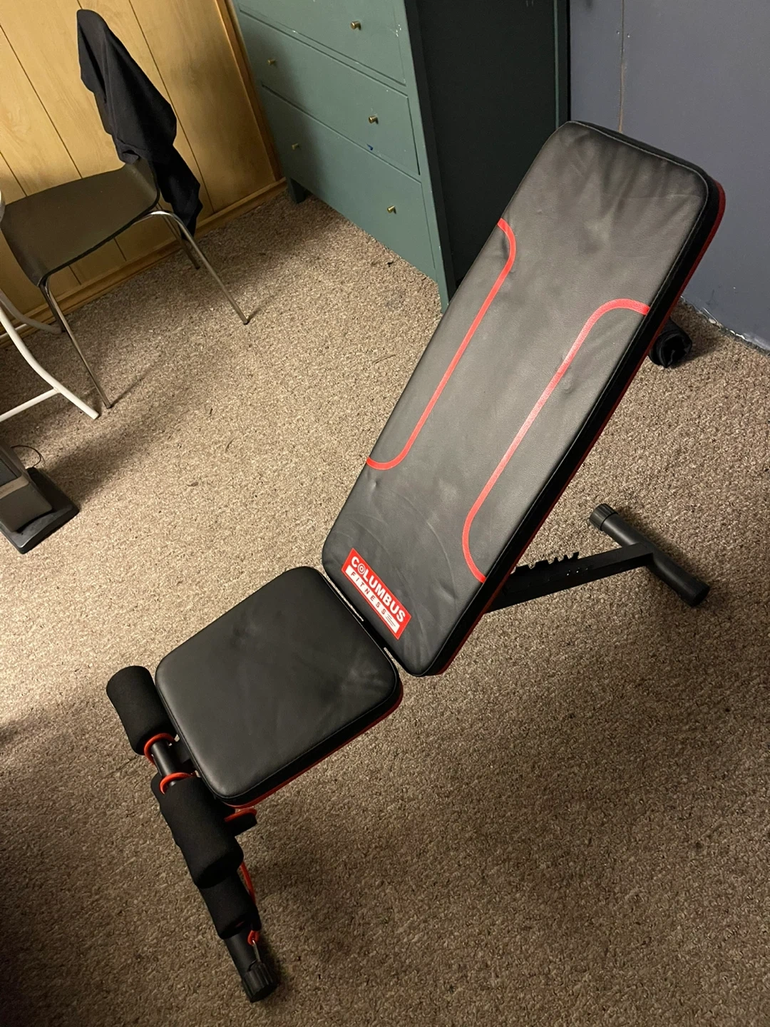 This is a Columbus Fitness adjustable weight bench. It's black with red trim and has padded leg rollers. The bench is adjustable for various workout positions.