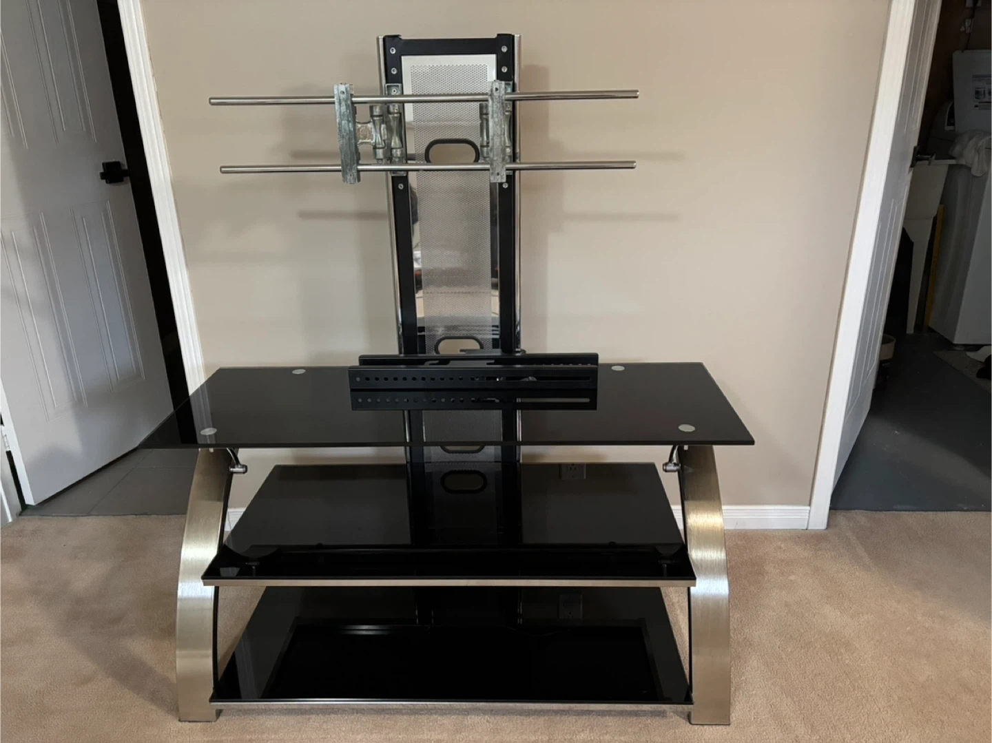 This is a three-tier glass TV stand with a built-in mount. It's made with black tempered glass shelves and a brushed metal frame. The stand offers ample space for media consoles and accessories.