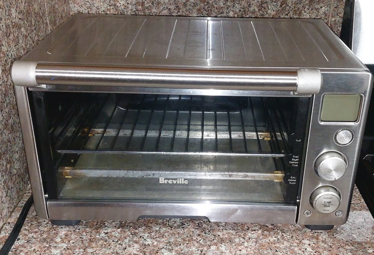 This is a Breville Smart Toaster Oven. It's made of stainless steel and features a digital display with various cooking functions. It has three rack positions and comes with a baking tray and crumb tray.