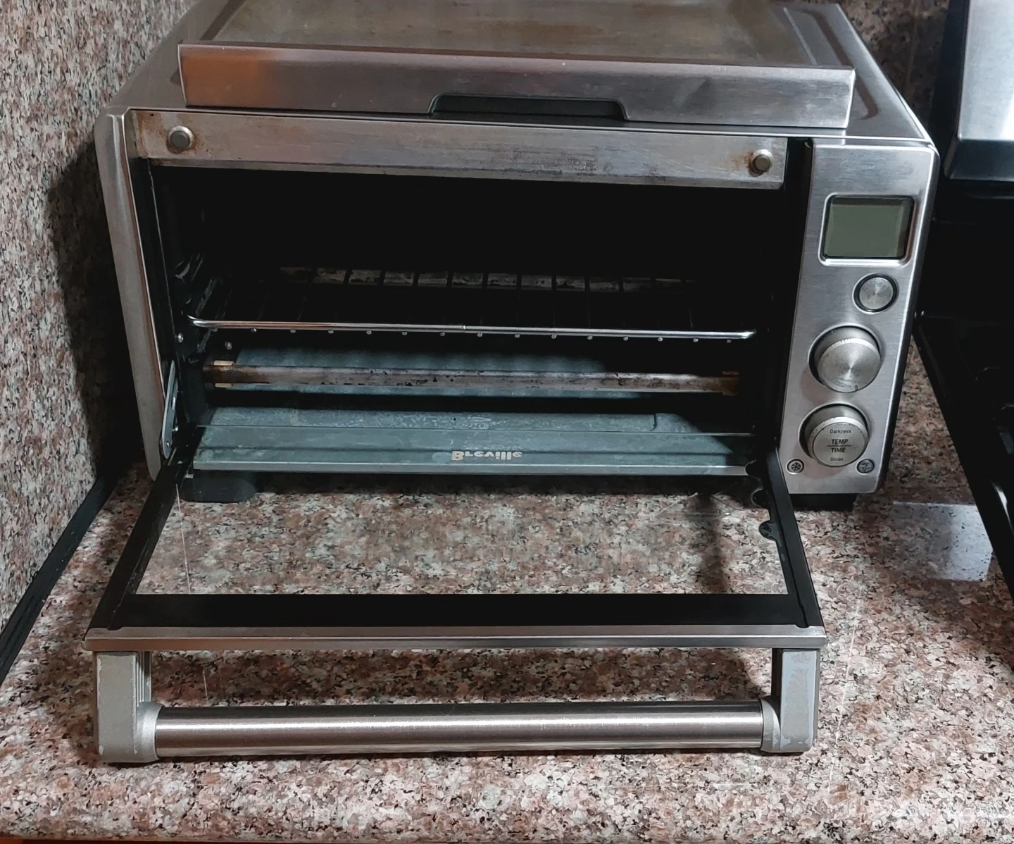 This is a Breville Smart Toaster Oven. It's made of stainless steel and features a digital display with various cooking functions. It has three rack positions and comes with a baking tray and crumb tray.