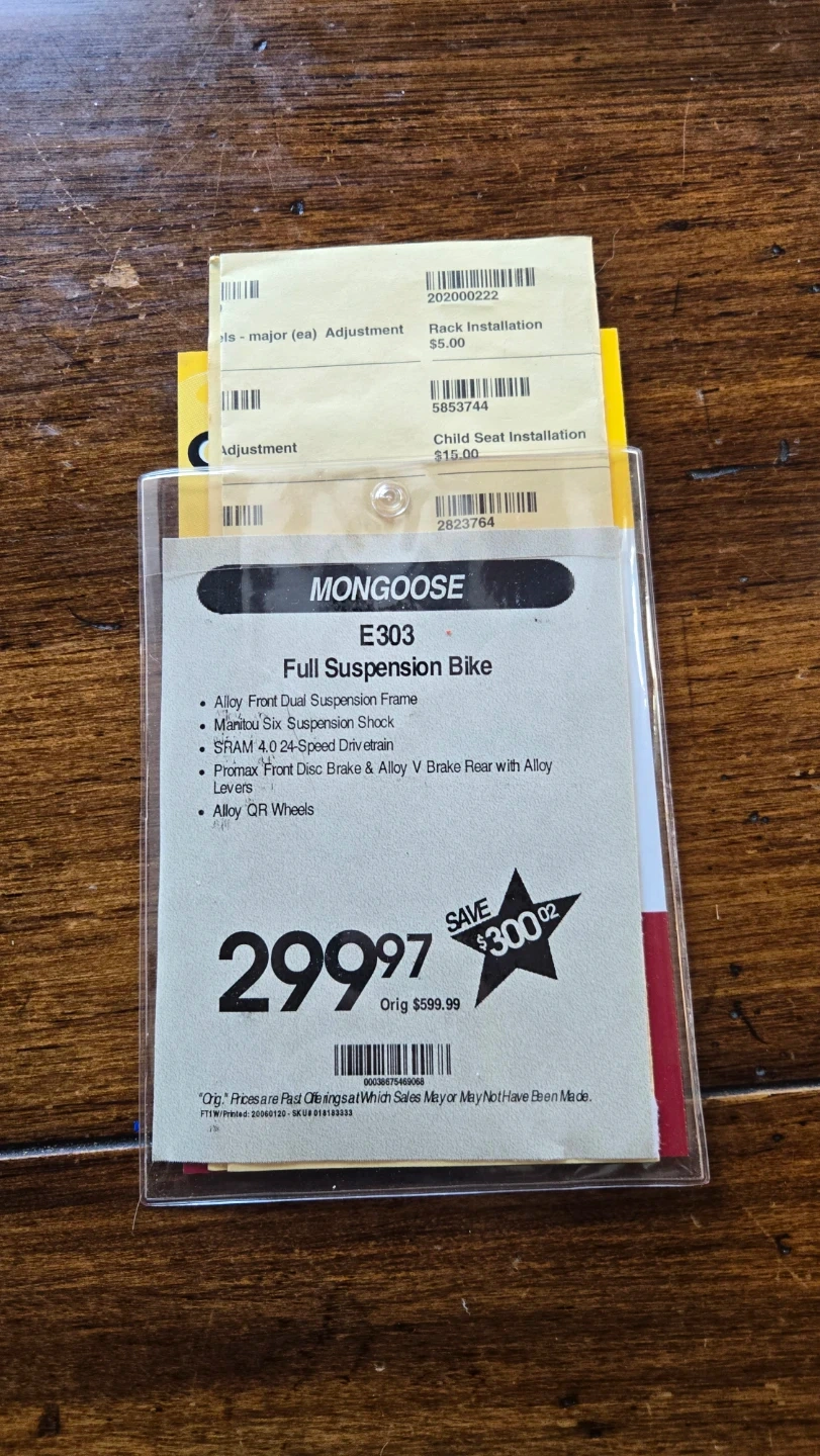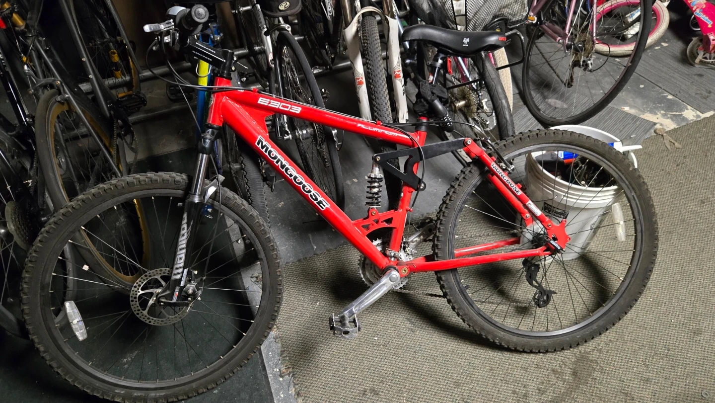 Red Mongoose E303 full suspension mountain bike. It's got an alloy front derailleur suspension frame, Manitou Six suspension shock, and a SRAM 4.0 24-speed drivetrain. It also features Promax front disc brake & alloy V brake rear with alloy levers and alloy QR wheels.