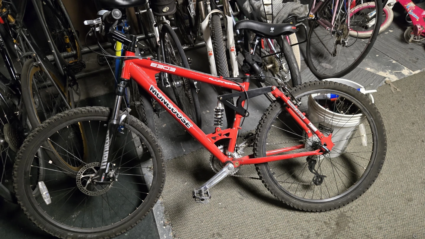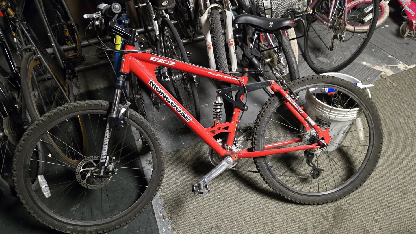 Red Mongoose E303 full suspension mountain bike. It's got an alloy front derailleur suspension frame, Manitou Six suspension shock, and a SRAM 4.0 24-speed drivetrain. It also features Promax front disc brake & alloy V brake rear with alloy levers and alloy QR wheels.