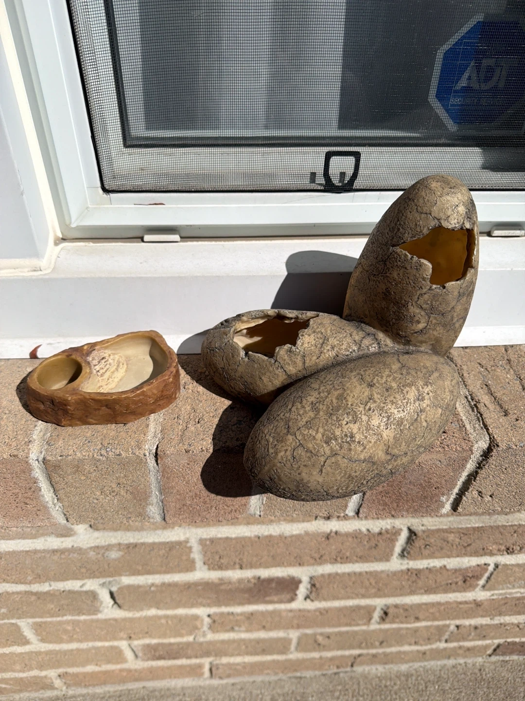 Includes three egg-shaped reptile hideouts and a dual-compartment food and water dish. The hideouts have openings for easy access. The dish is sturdy and easy to clean. Great for creating a naturalistic environment for your pet.