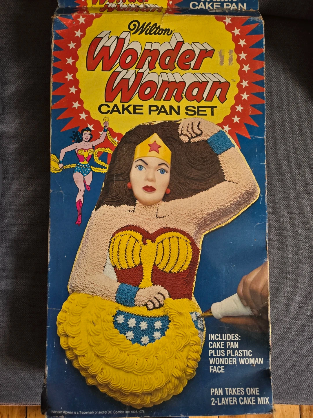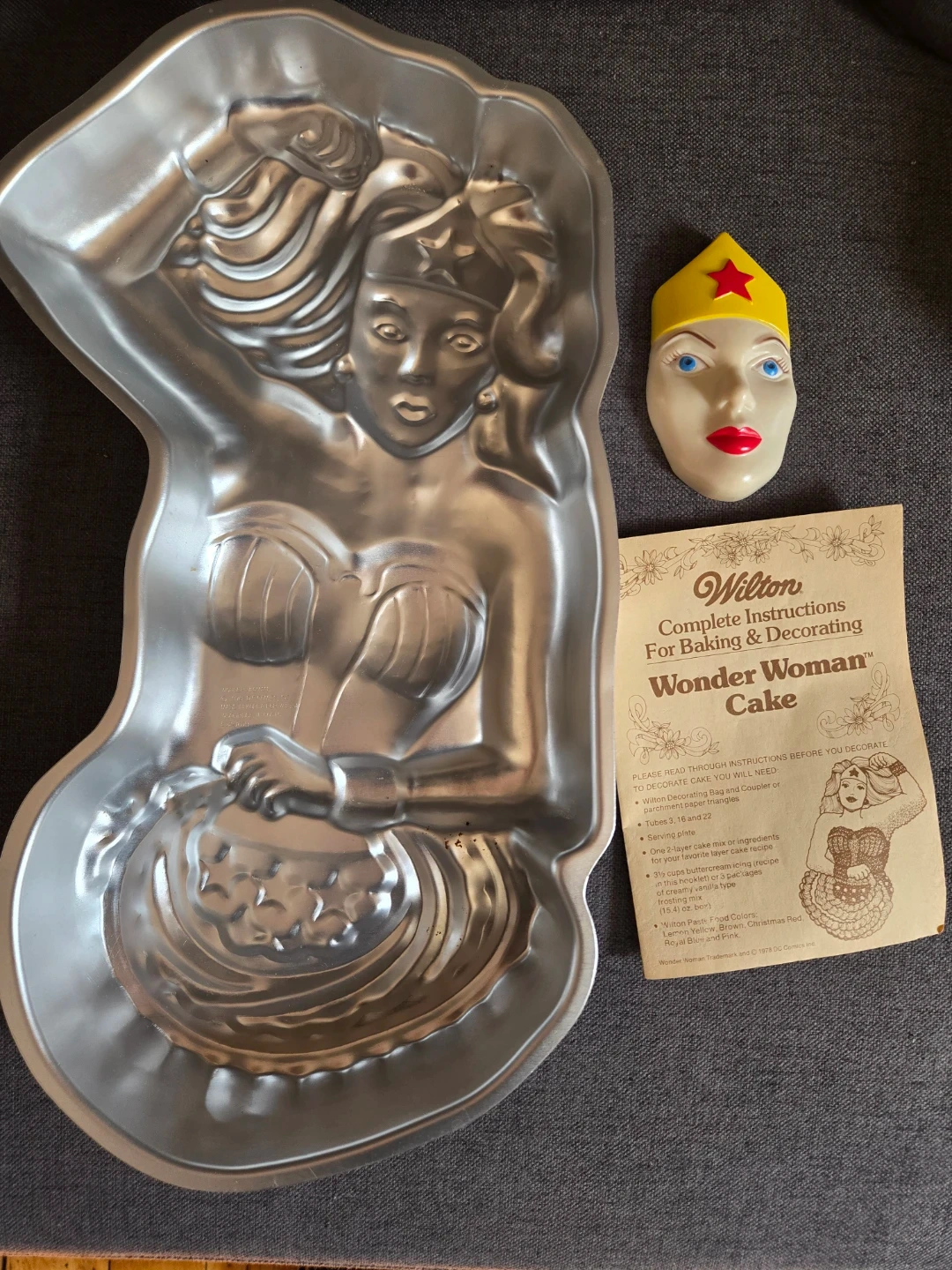 Vintage Wilton Wonder Woman cake pan set. Includes the metal cake pan, plastic Wonder Woman face, and complete decorating instructions. Pan takes one 2-layer cake mix. Pan dimensions are 14.5 inches tall by 10.5 inches wide.