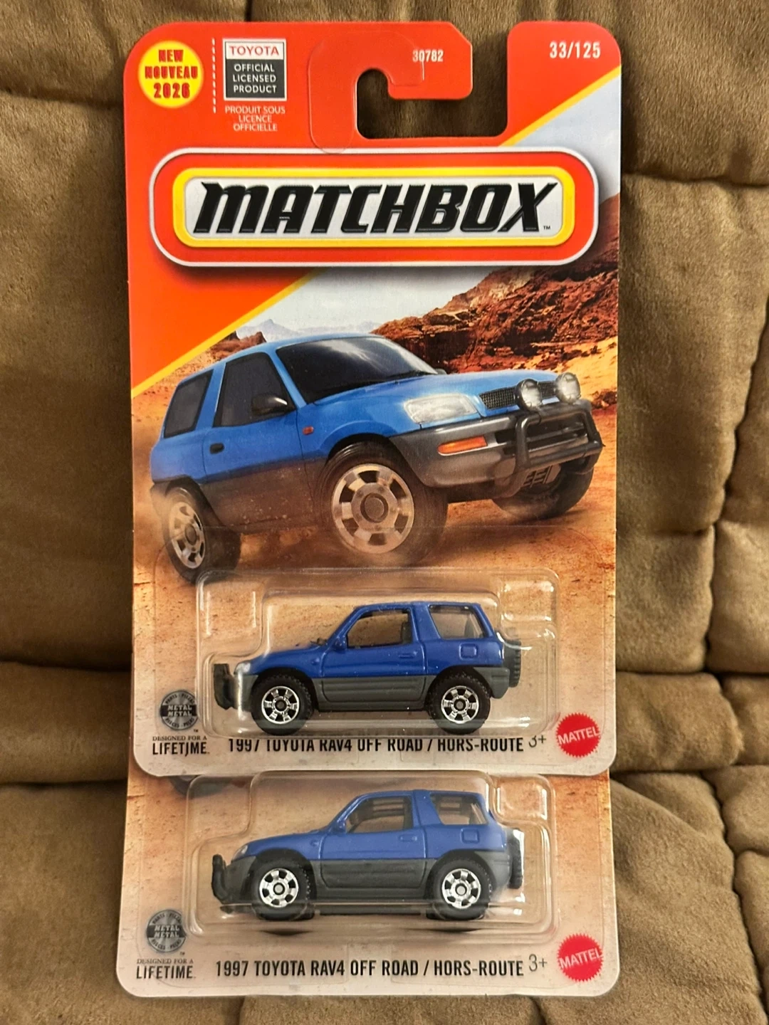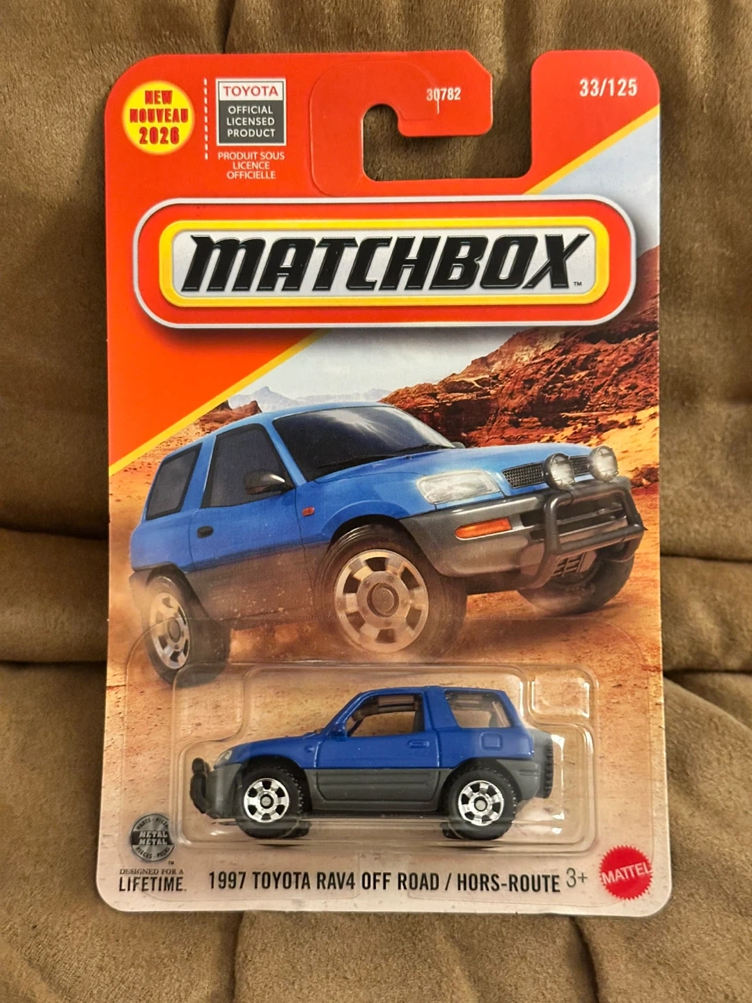 This is a Matchbox 1997 Toyota RAV4 Off-Road die-cast toy. It's officially licensed by Toyota and comes in its original packaging. This miniature vehicle is great for collectors or playtime!