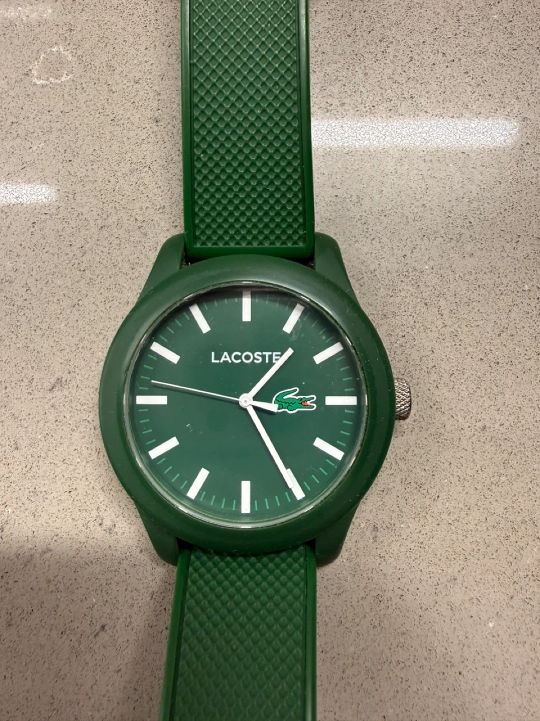 This is a Lacoste watch with a green band. The watch is in used condition, as shown in the photos. It's a stylish timepiece that could be a great addition to your collection.