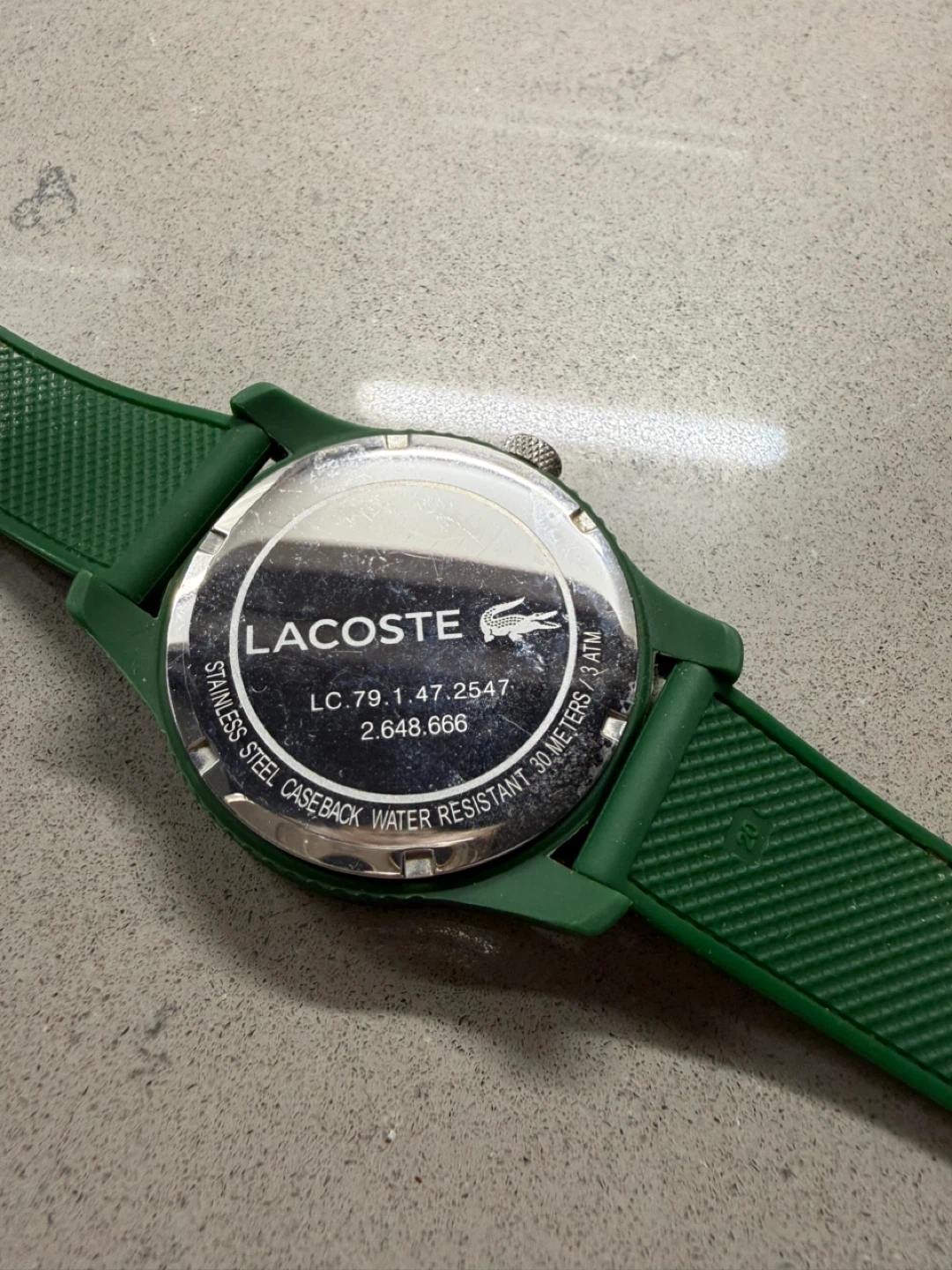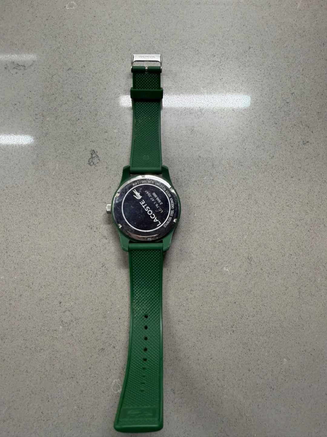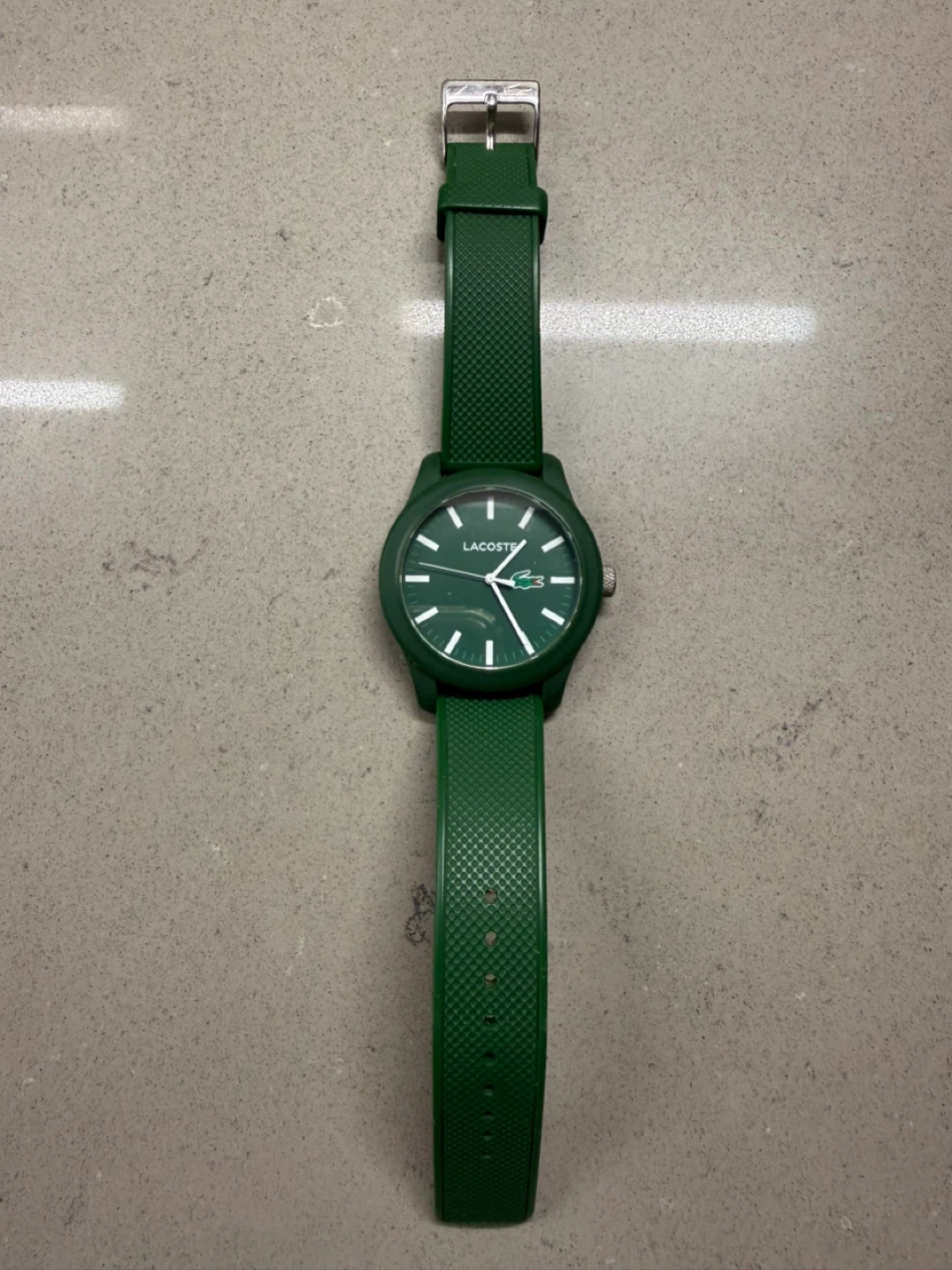 This is a Lacoste watch with a green band. The watch is in used condition, as shown in the photos. It's a stylish timepiece that could be a great addition to your collection.