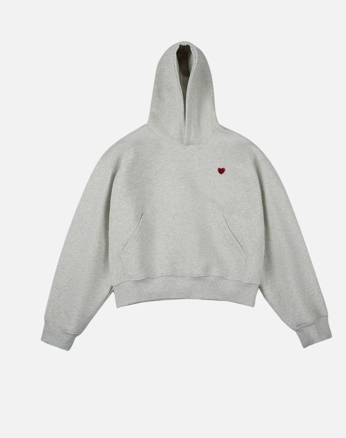 This is a light grey cropped hoodie. It features a small embroidered red heart on the left chest. The hoodie has a front pouch pocket and ribbed cuffs and hem. It's made from a soft, mid-weight fabric.