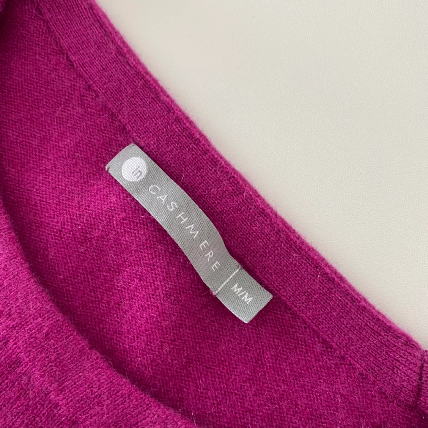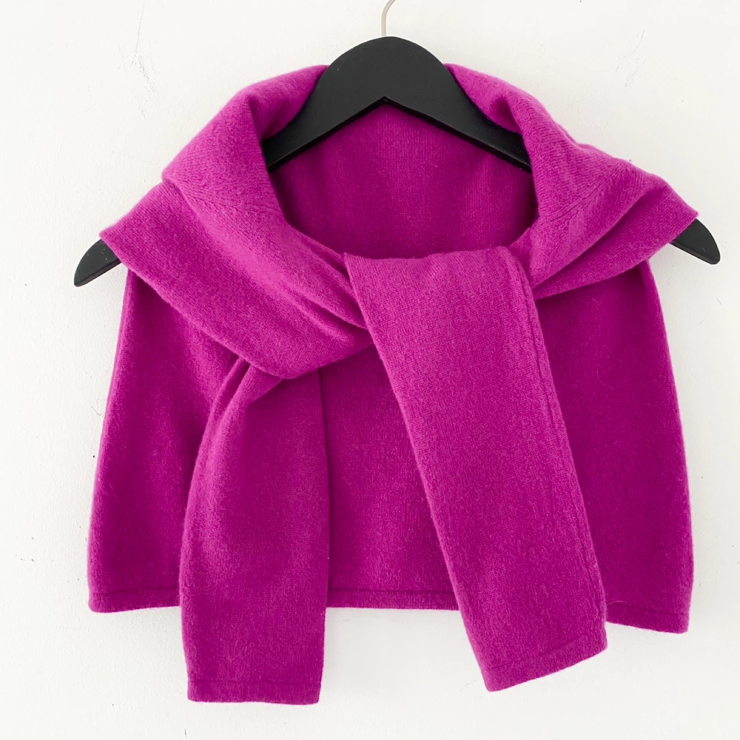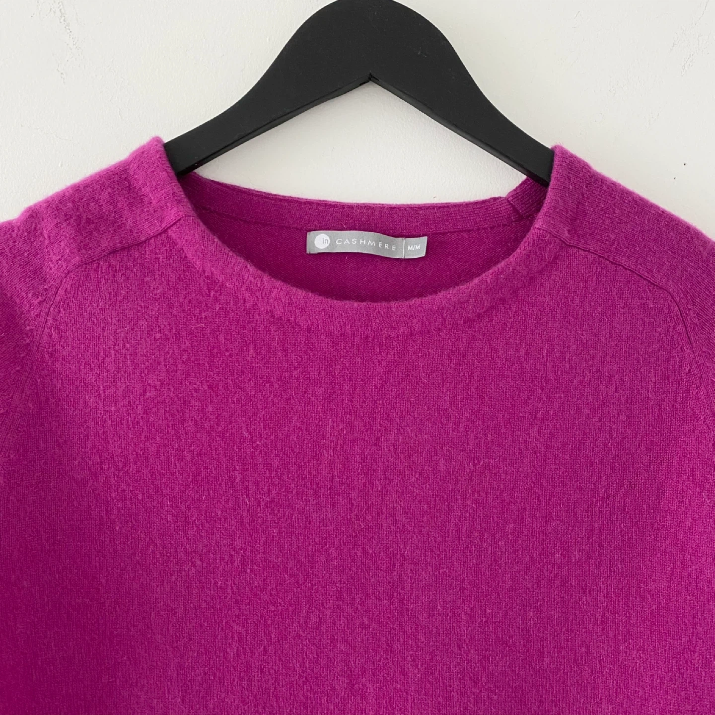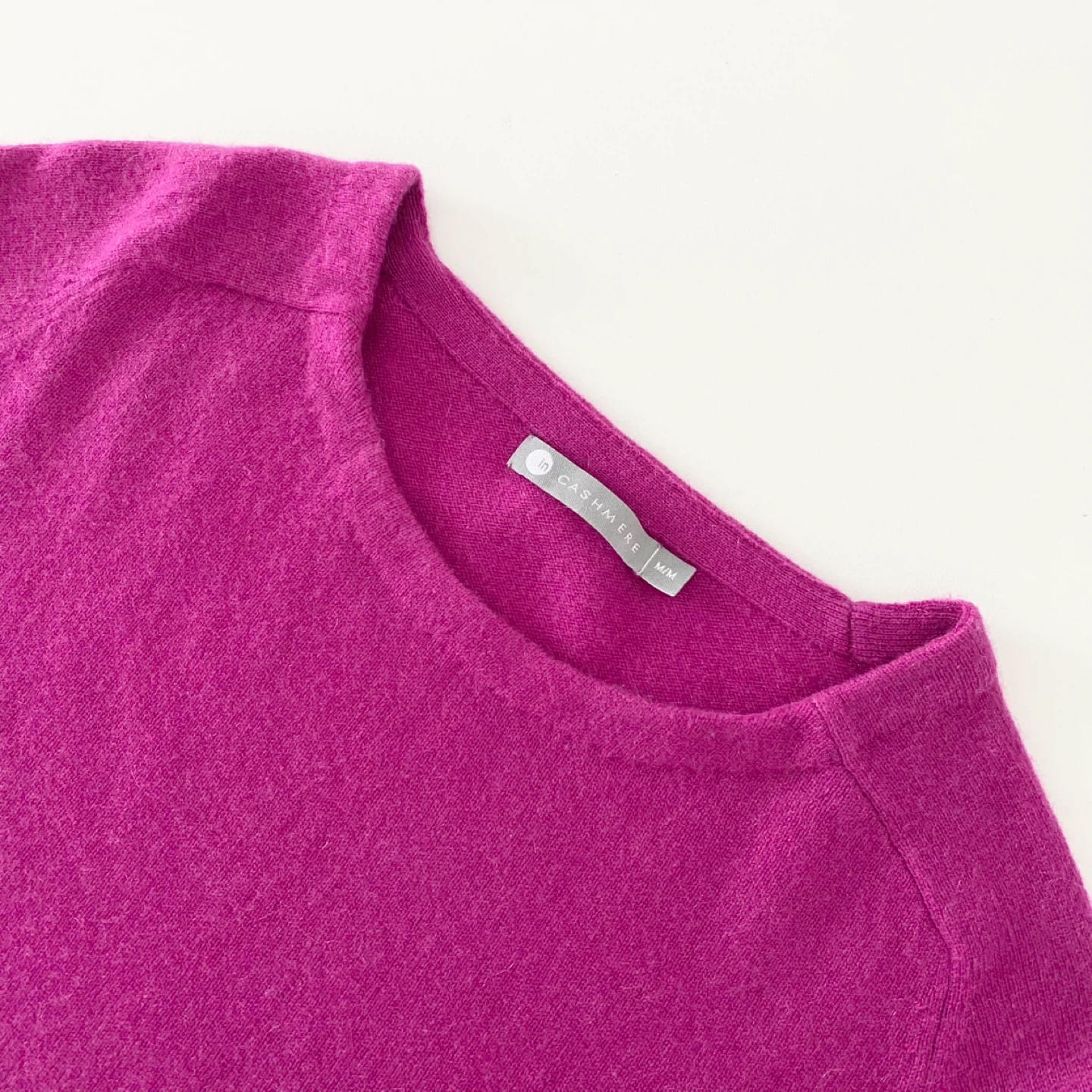 InCashmere raglan crew / boat neck sweater. Made of lightweight 100% cashmere in a magenta colour. It's incredibly soft, cozy and luxe. I don't find it itchy but it's subjective. Can be worn many seasons. Love wrapping it around the neck as a scarf. There's no staining, pilling or damage. It's clean and in excellent condition.