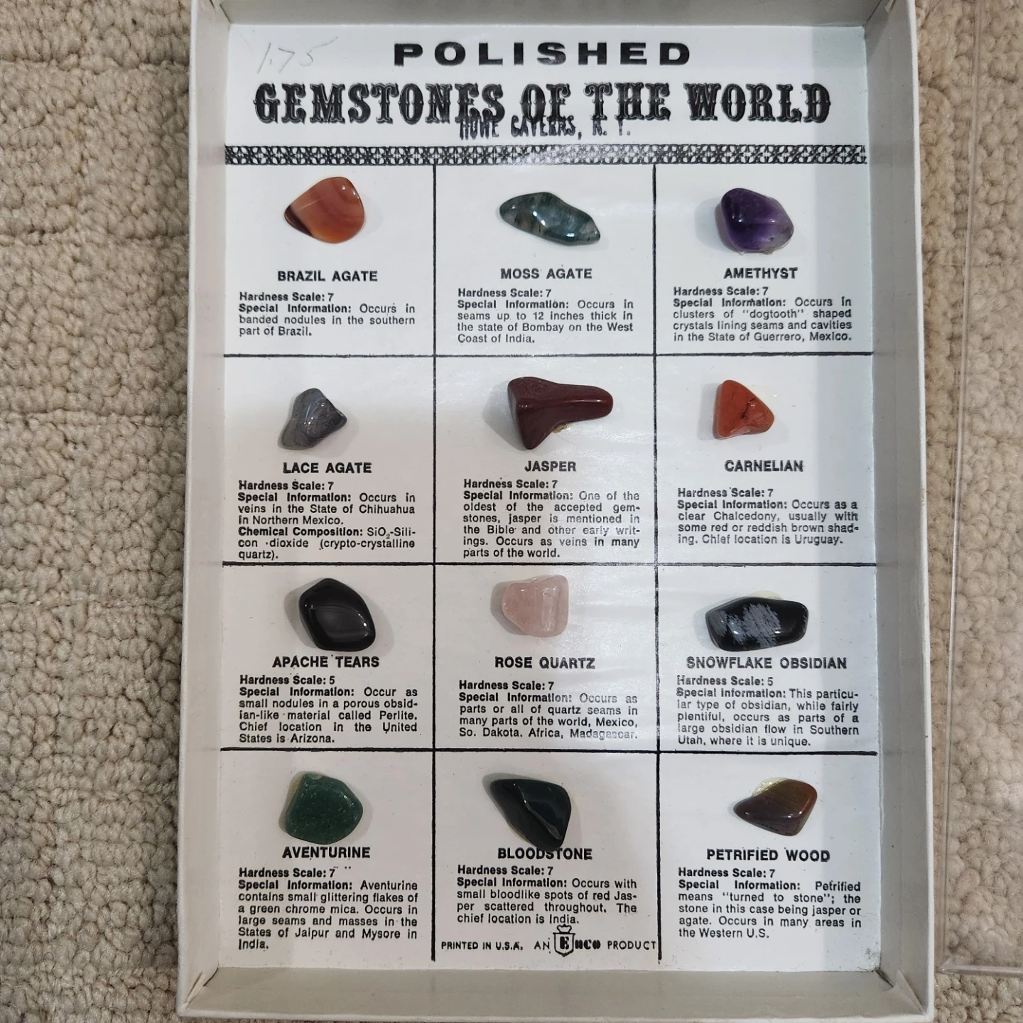 This collection showcases twelve polished gemstones from around the world. Each specimen includes a brief description of its origin and mineral properties. Great for educational display or hobbyists!