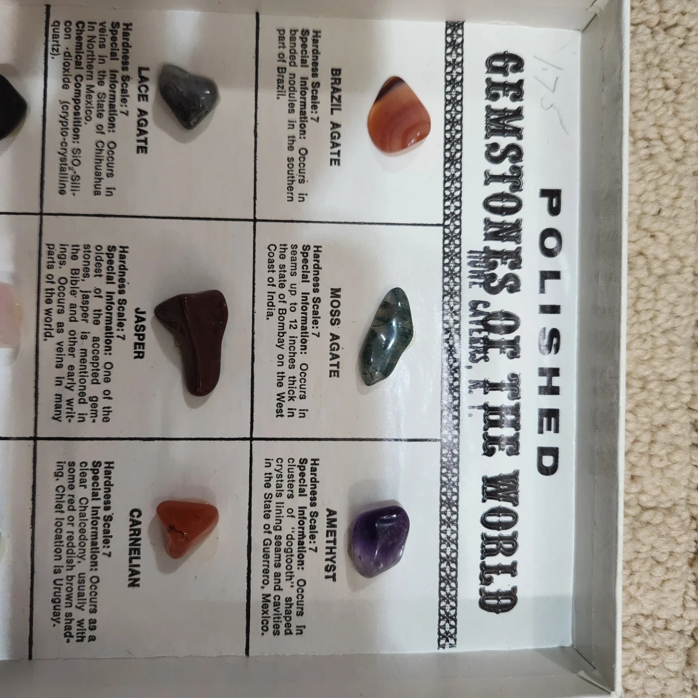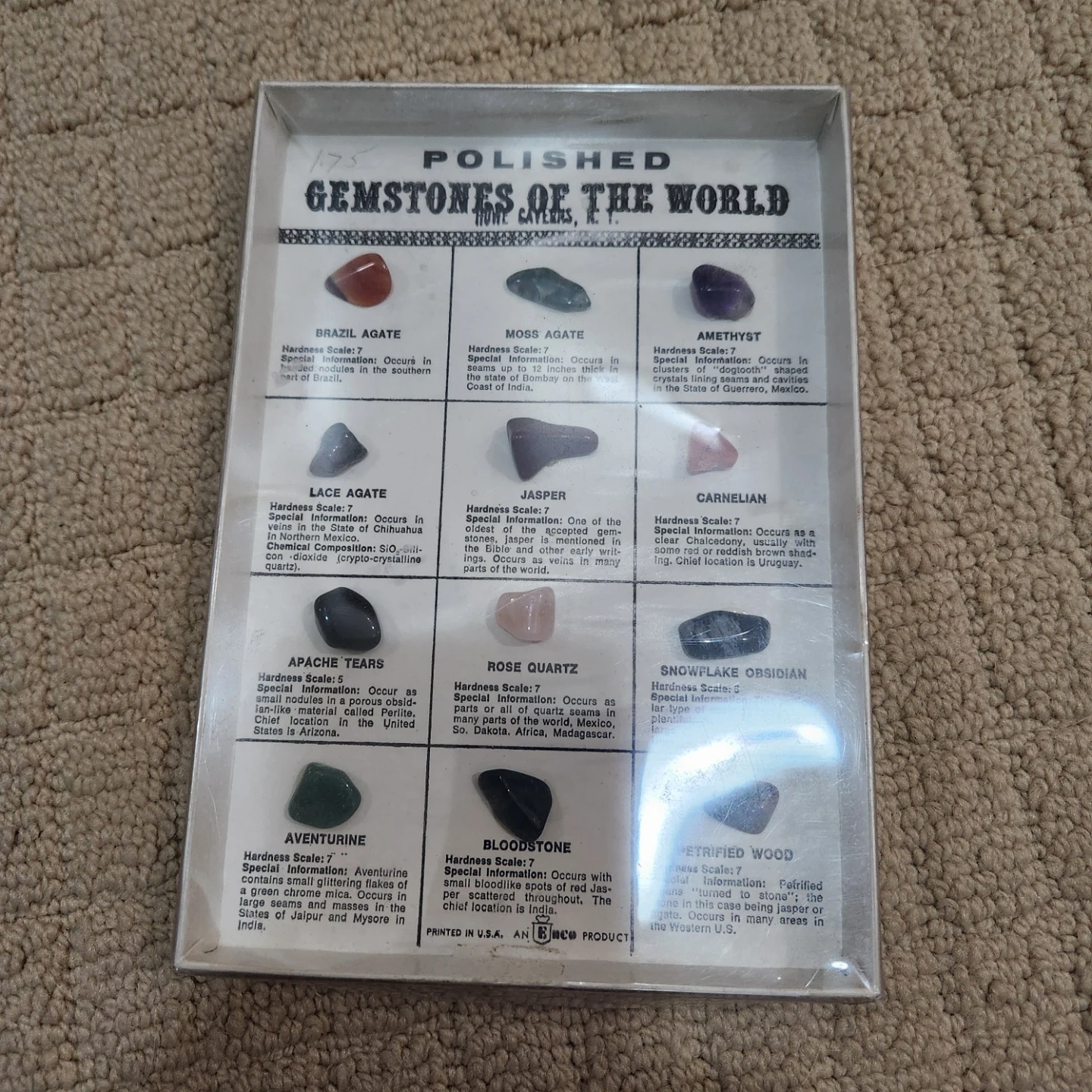 This collection showcases twelve polished gemstones from around the world. Each specimen includes a brief description of its origin and mineral properties. Great for educational display or hobbyists!