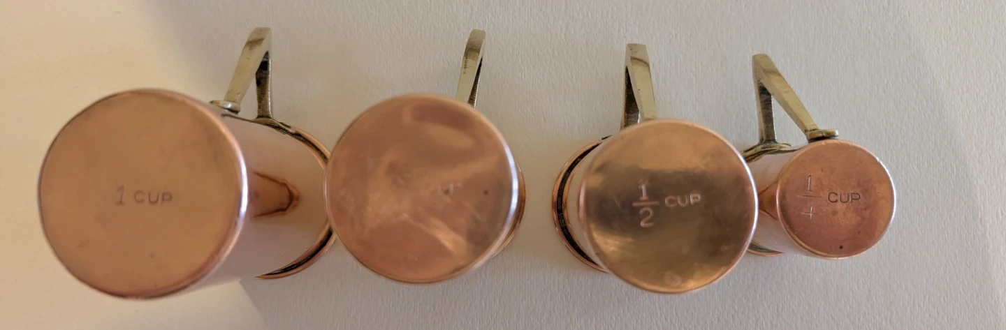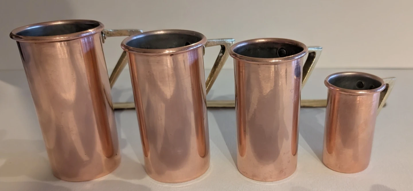 Buy & SellVintage Copper Measuring cups set of 4Vintage Copper Measuring cups set of 4$601960's Vintage Copper set of 4 measuring cups with brass handles and brass holder ConditionGoodDimensions4 " - 2" cups holder 12"WHERE TO MEETRiver Street & Queen Street EastView MapSELLERverifiedClareOld Toronto44329 reviews0 chats·1 favorites·27 viewsSEND CHAT TO SELLERHi Clare! I’m interested in your listing.Hi Clare! I’m interested in your listing.Get the Karrot app to chatSign In to chat