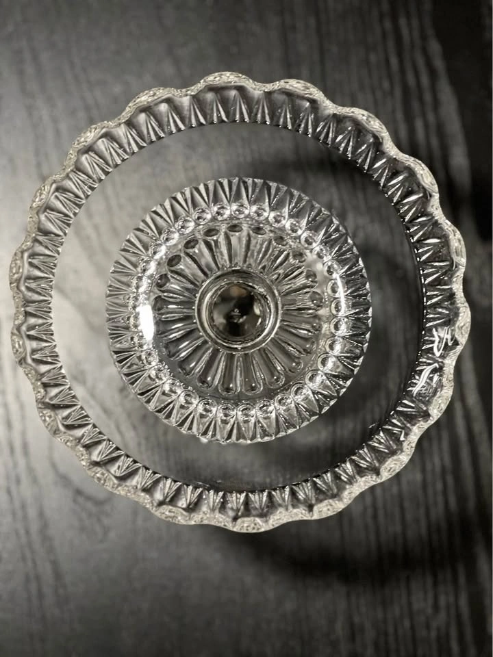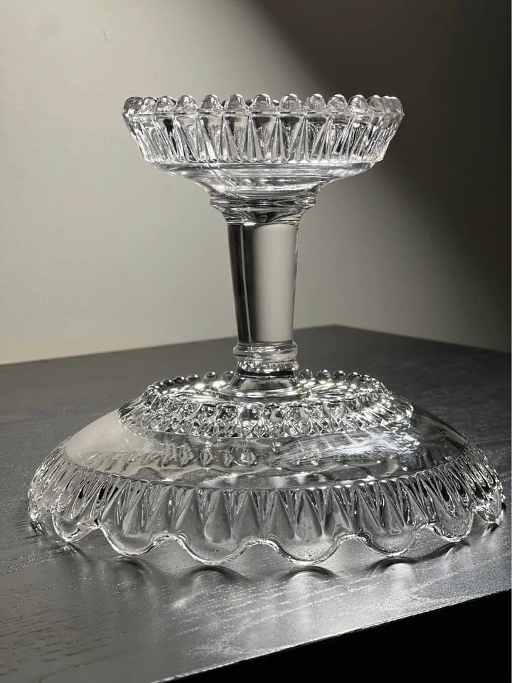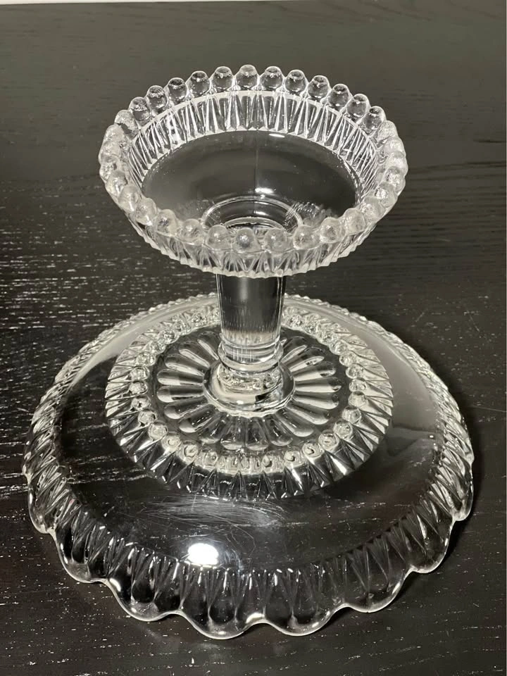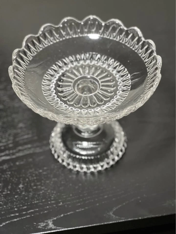 This is an antique Early American Pattern Glass (EAPG) open compote in the Fulton pattern, also known as Martha's Tears. The pattern was introduced around 1889. It features a scalloped or sawtooth rim and a design often referred to as "Noonday Sun" or "Saw Tooth Bottom" on the base. Made of clear, heavy-weighted pressed glass. EAPG items are highly collectible antique glass pieces. Compotes were traditionally used for serving fruits, candies, jellies, or desserts, and are popular today for centerpieces or general decor. Measurements approximately: 5.75β in height and 6.75β in diameter. Pre-owned. Pickup is 58th and 7th Ave in midtown Manhattan.