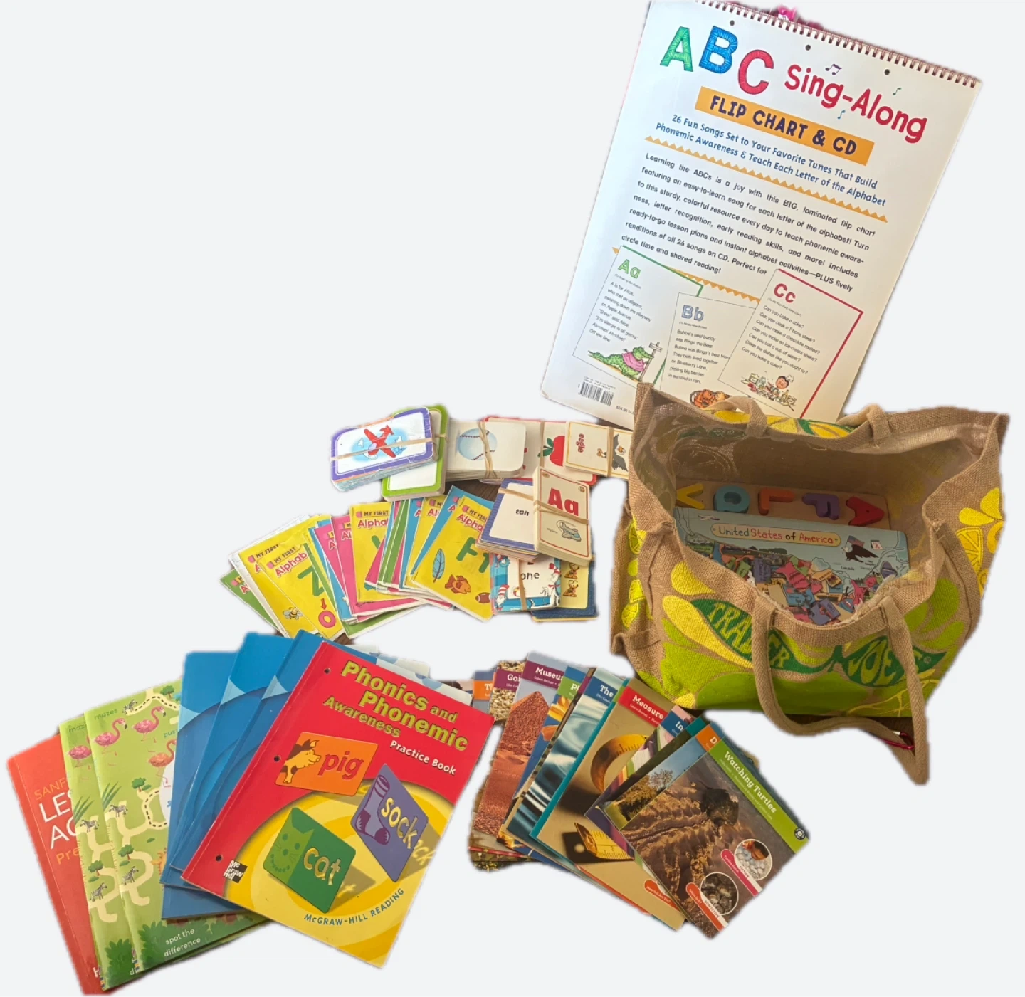 This educational set includes an ABC Sing-Along flip chart excludes CD. It also contains multiple "My First Alpha" books, a "Phonics and Phonemic Awareness Practice Book" from McGraw-Hill Reading, flash cards*, a United States of America puzzle* and Alphabet wooden letters. Additional learning books are also included.