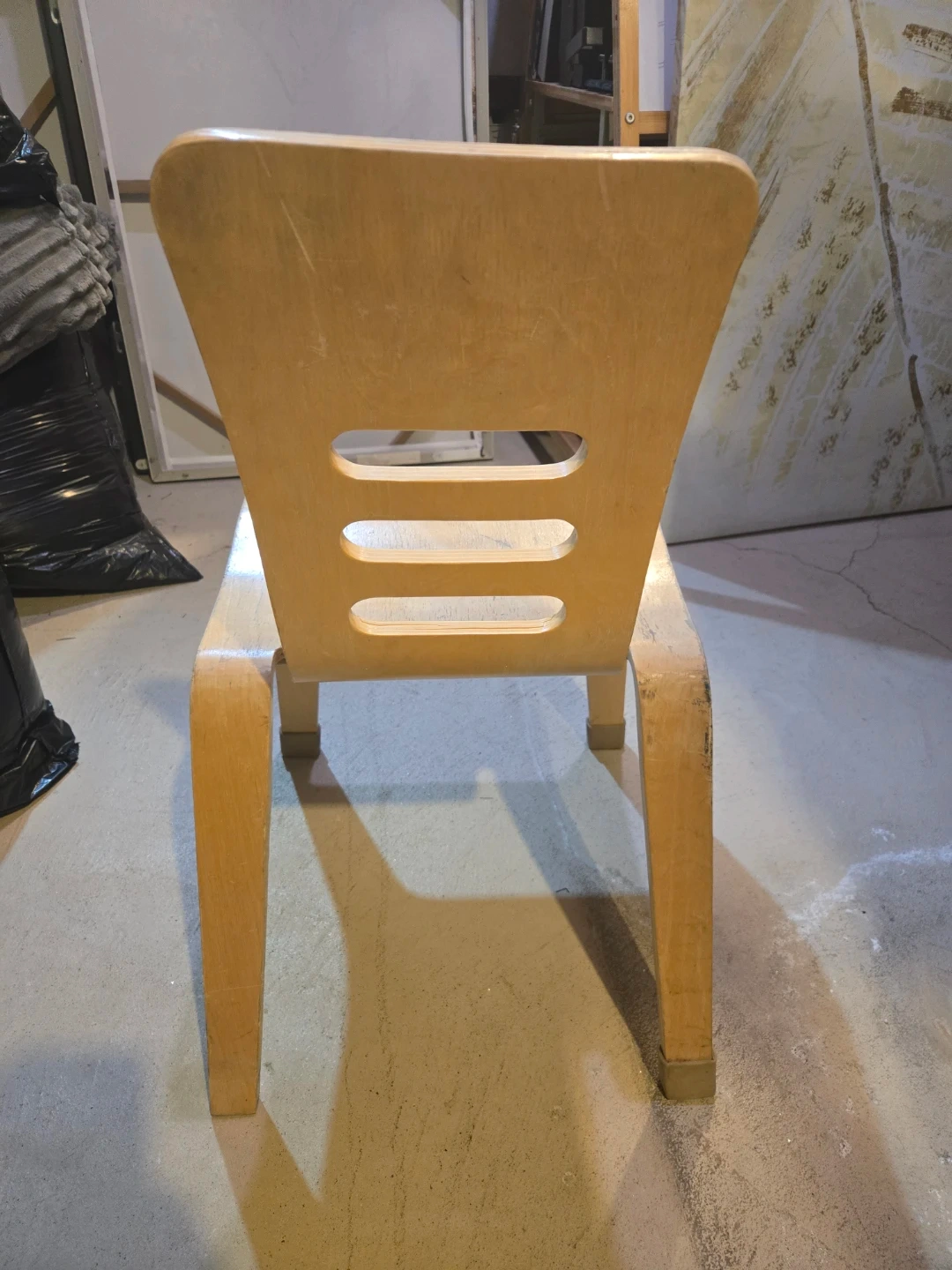 This is a bentwood children's chair with a slatted back. It's made of light-coloured wood. Perfect for a playroom!