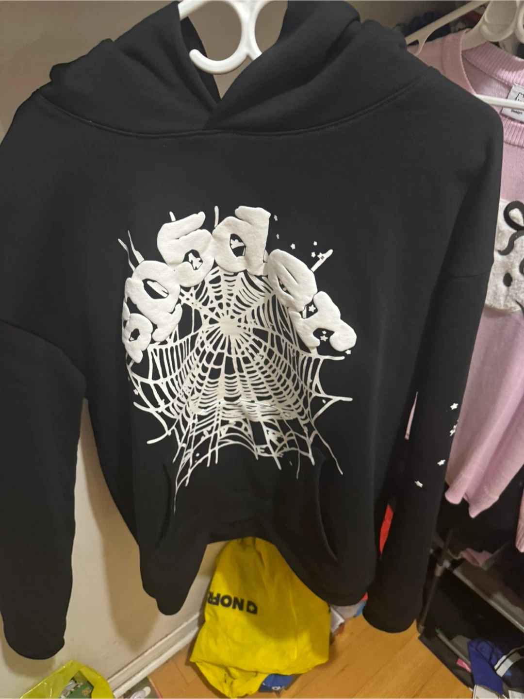 This is an Authentic black SP5DER hoodie in size XL. It's made in Los Angeles and features a spiderweb graphic on the front. I bought originally from StockX for my dad but he dosent like the design. It can fit size L too.