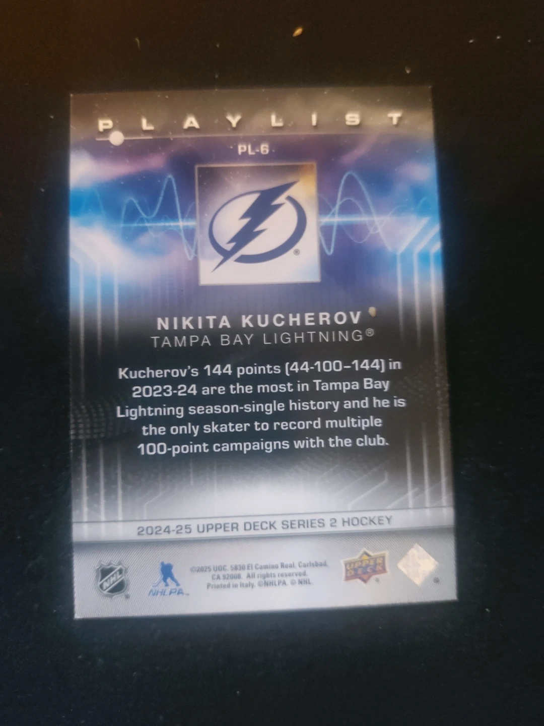 This is a 2024-25 Upper Deck Series 2 hockey card featuring Nikita Kucherov of the Tampa Bay Lightning. Kucherov's 144 points in 2023-24 made him the most productive player in Tampa Bay Lightning history. He's the only skater to achieve multiple 100-point campaigns with the club. Card printed in Italy.