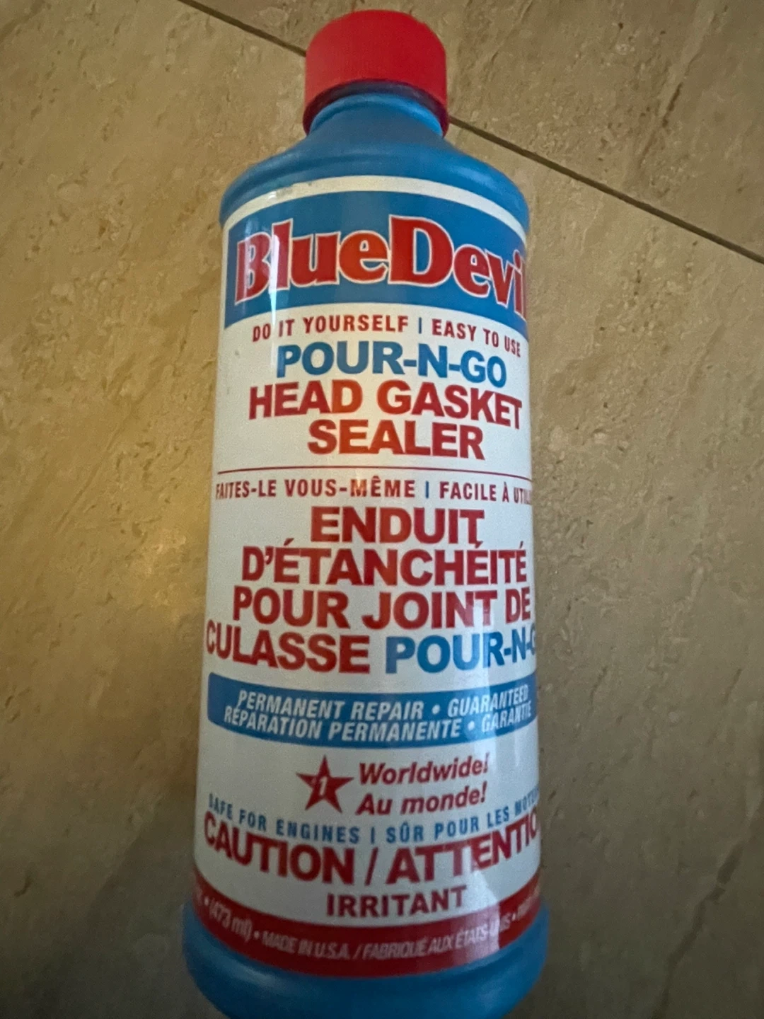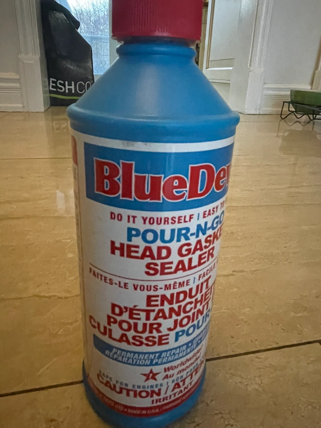 This is a bottle of Blue Devil Pour-N-Go Head Gasket Sealer. It provides permanent repair and is guaranteed. It's safe for engines and is listed as irritant.