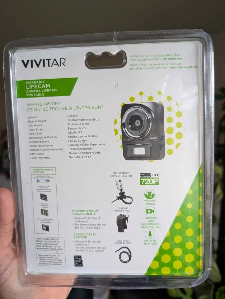This is a new, wearable portable HD 720P camera. It's great for capturing moments and features timelapse video and a built-in mic. Comes with a bicycle mount, clip mount, neck strap, USB cable, and rechargeable lithium battery. A Micro SD card (Class 4 or higher) is needed, but not included.