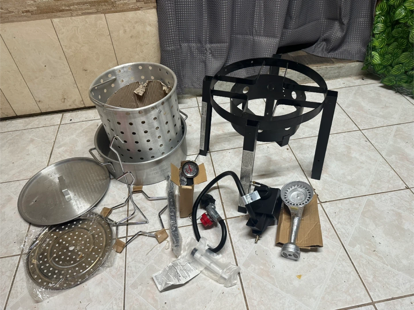 This is a large aluminum deep fryer pot with a perforated basket and lid. It comes with a heavy-duty propane burner stand and a thermometer. Everything you need for outdoor cooking is included!