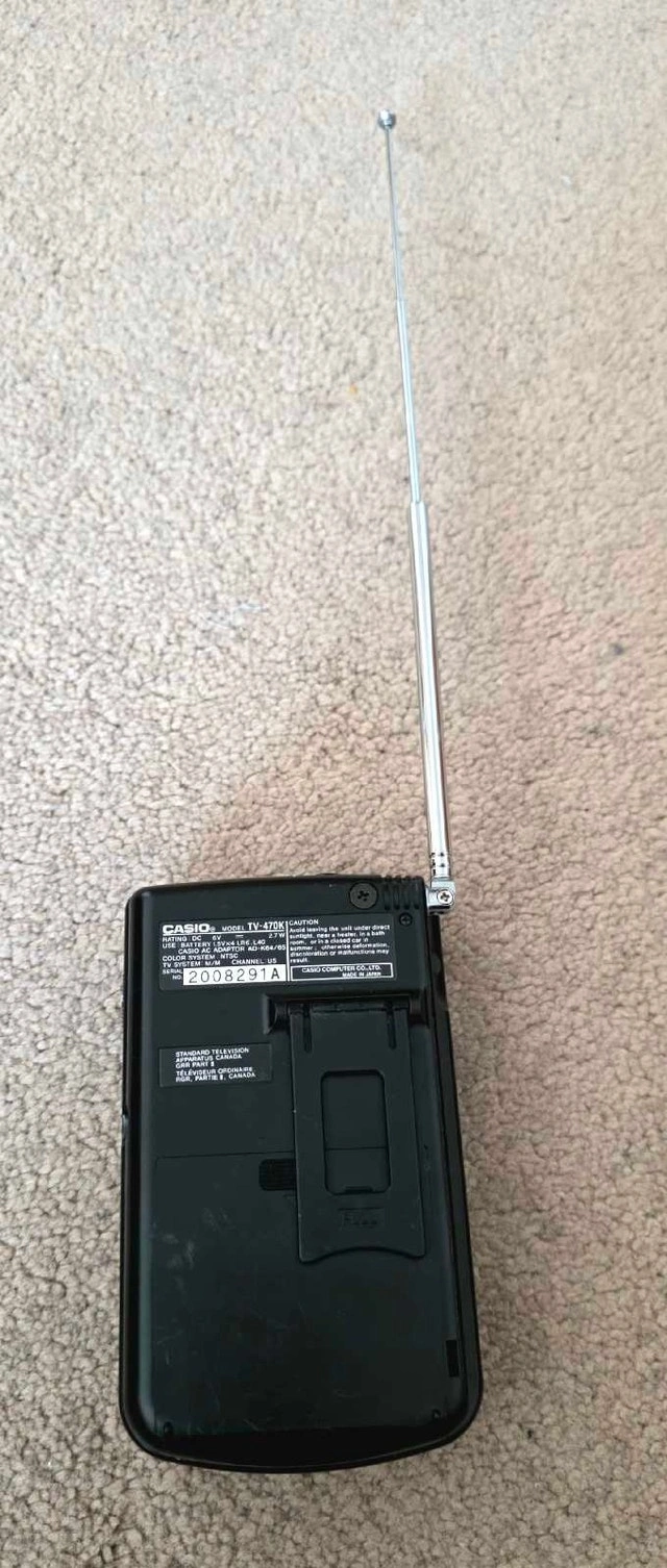 A diverse variety of vintage items. Includes: Casio TV-470 Pocket Color TV, Military Canteen & Web Belt Set, Royal Canadian Air Cadets Brass Cap Badge, West German Dual Map Measurer & Compass Set (includes leather pouch).