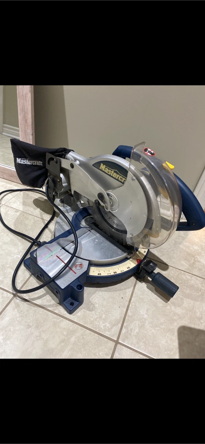 This Mastercraft mitre saw is a great tool for home projects. It has a powerful motor and a clear dust bag. Ideal for cutting wood and other materials with precision.