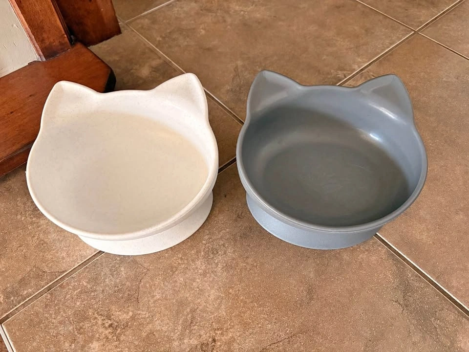 Kitty city 2 pack elevated pet bowls made from polypropylene plastic. These bowls are elevated and raised to promote proper digestion and are "whisker-friendly" as they are wide and oval shaped! Pickup Evanston NW.