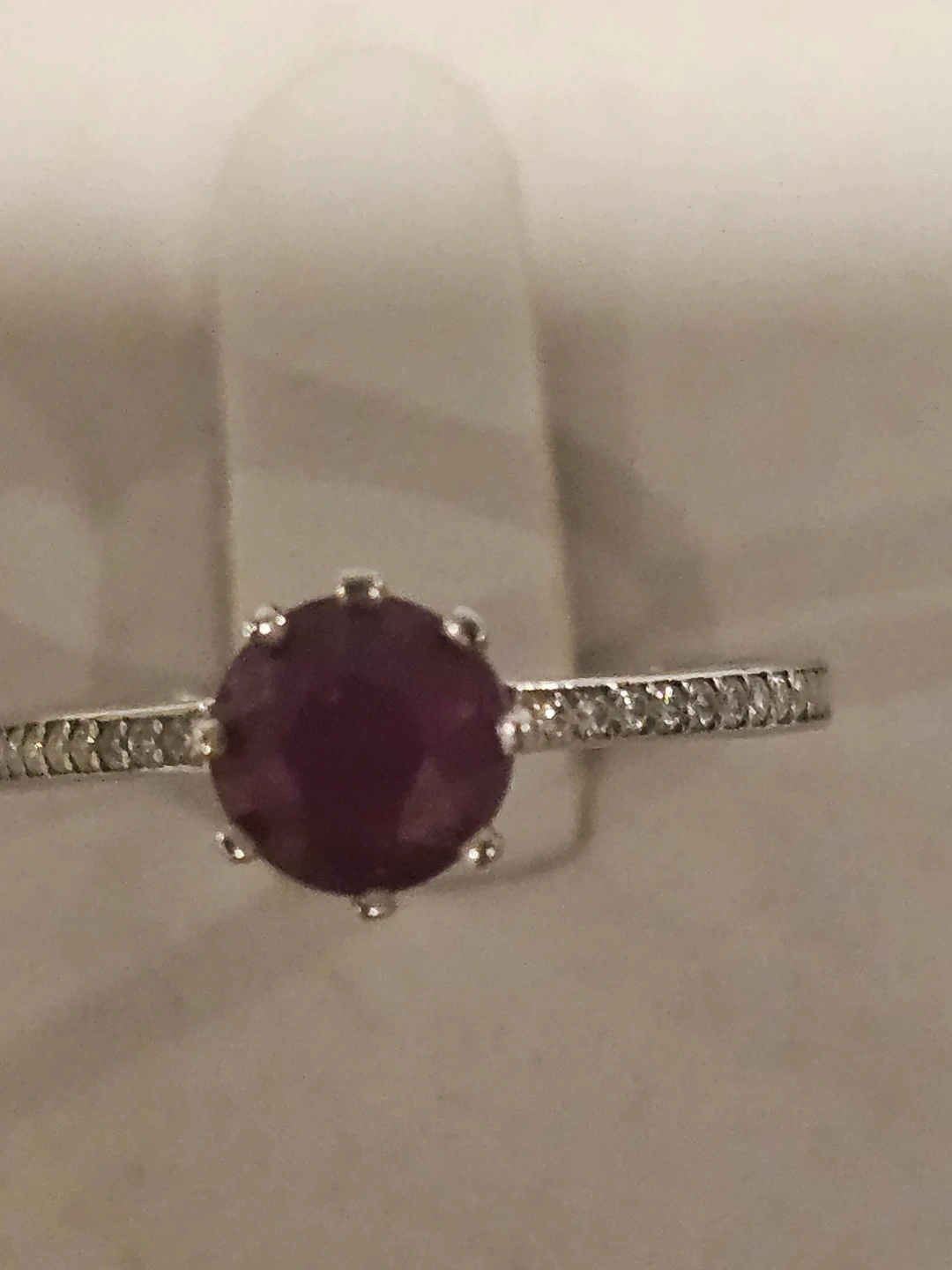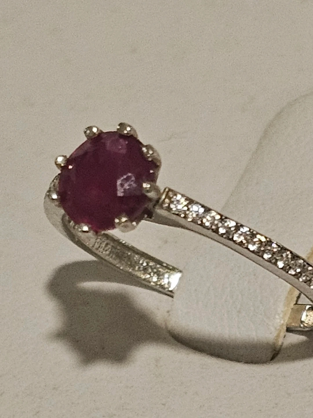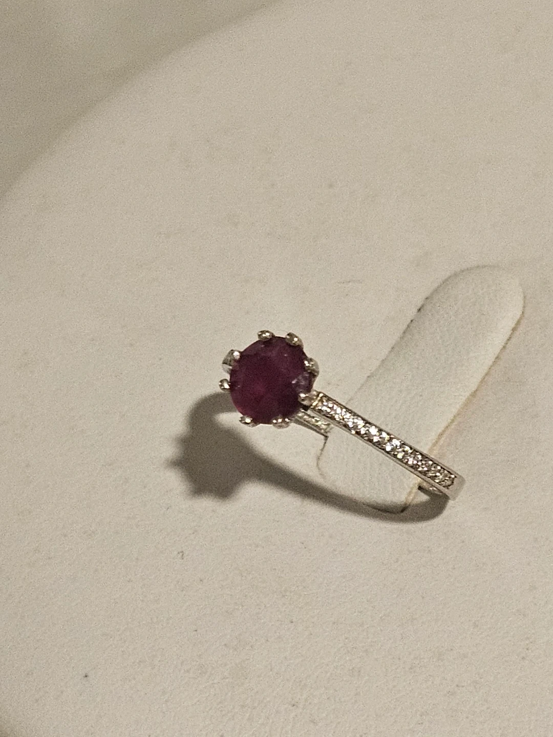 A beautiful ruby ring with simulated diamond accents on the band. 925 SterlingSilver.