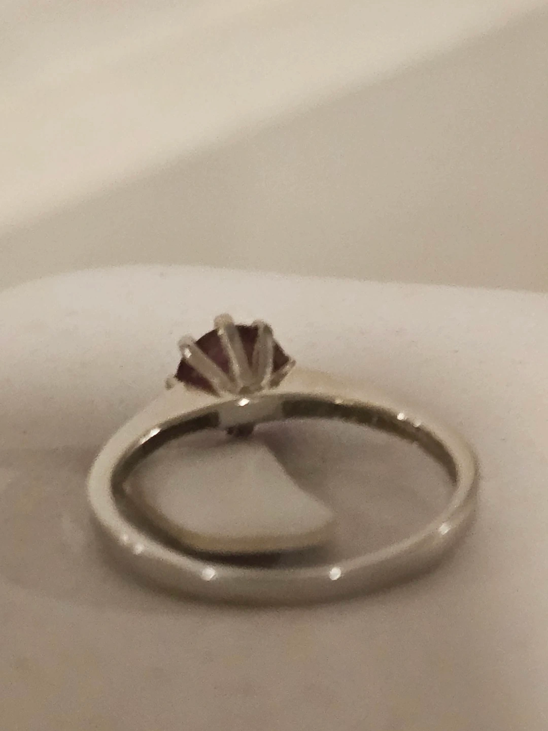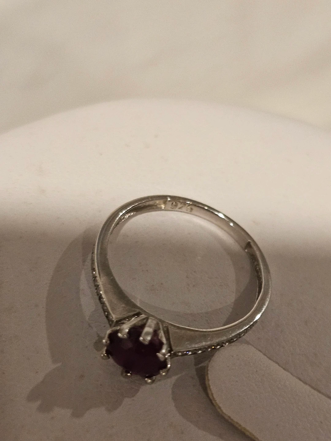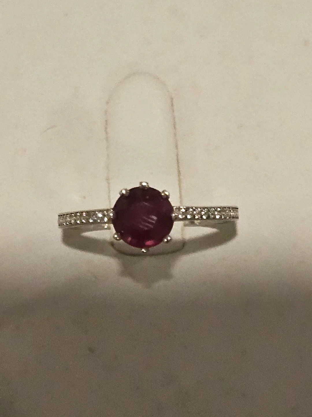 A beautiful ruby ring with simulated diamond accents on the band. 925 SterlingSilver.