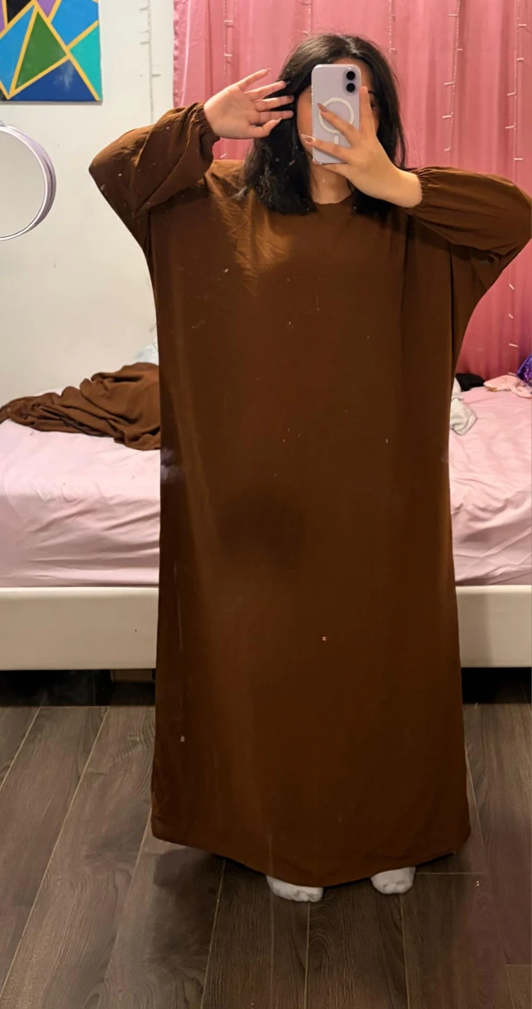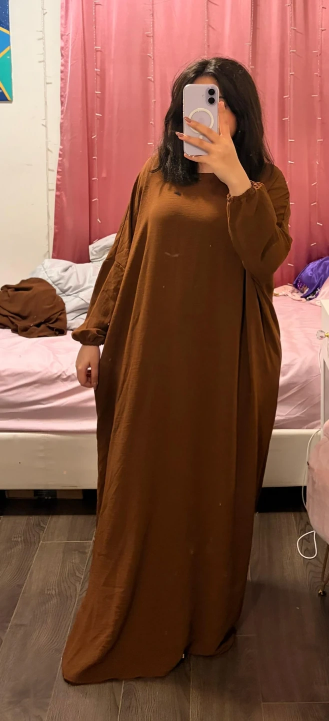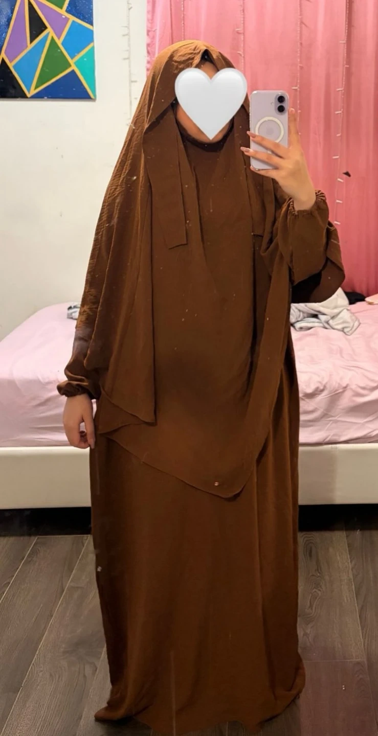 A flowy black abaya complete with a matching hijab. It's made from a lightweight fabric and has gathered sleeves. This modest wear is comfortable and stylish for everyday use.