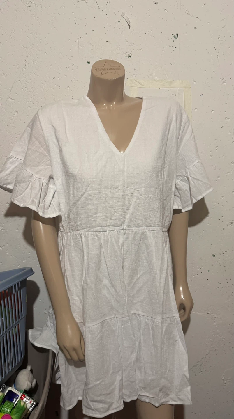 Cute white mini dress with ruffle sleeves! This dress is perfect for a casual summer day or a night out. It's in great condition and ready for a new owner