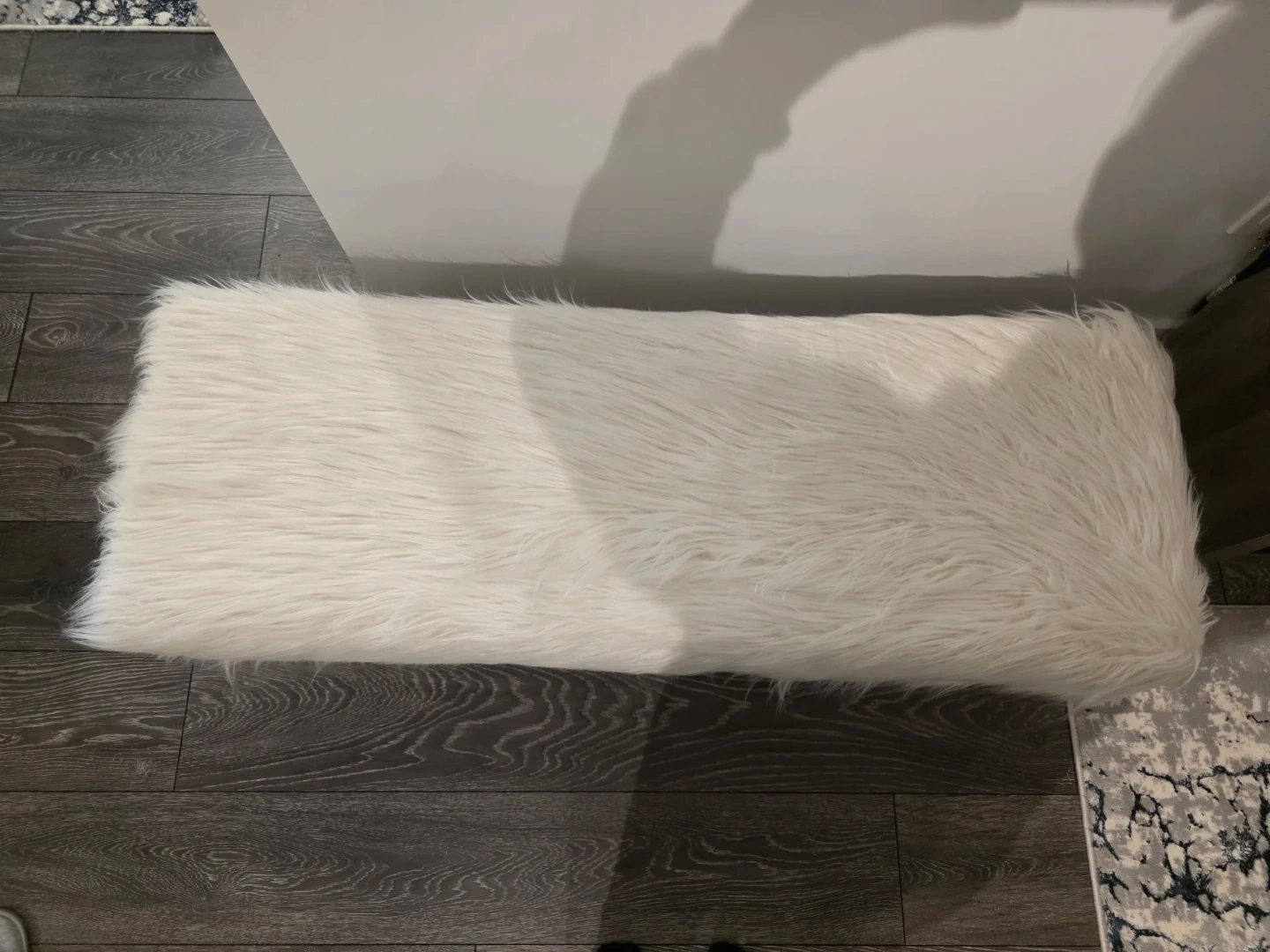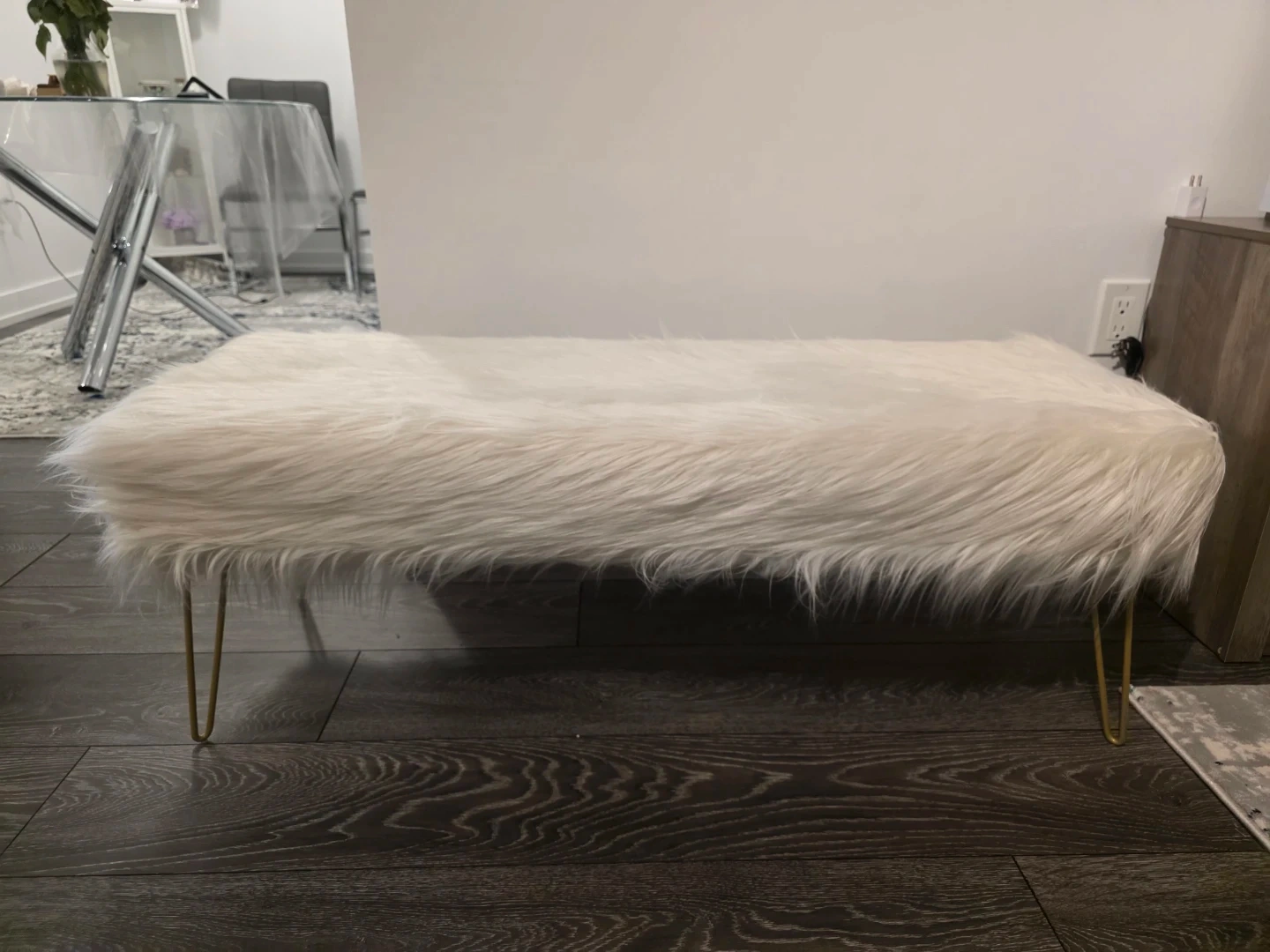 This white faux fur bench adds a cozy touch to any room. It features stylish gold hairpin legs for a modern look. Perfect for an entryway or at the foot of a bed!